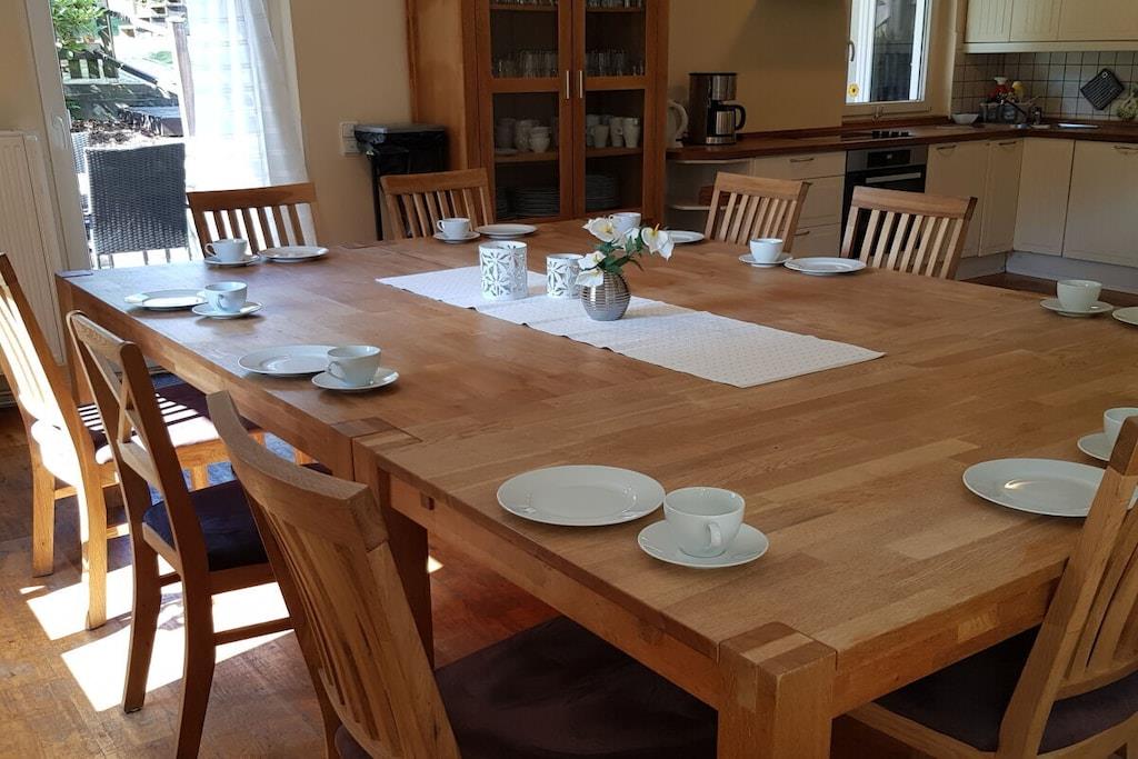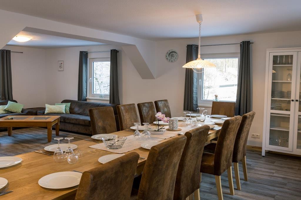 Die 260 m² große Ferienwohnung in einem ehemaligen Mühlengebäude wurde 2022 komplett saniert. Die 9 Schlafzimmer auf zwei Ebene, alle mit Doppelbett, und ein Familienzimmer mit Kinderbett und Einzelbett, sowie 3 Bäder und ein Gäste-WC gehören genauso zur Wohnung wie eine eigene Sauna. Der offene Wohnbereich besteht aus Wohnzimmer, Esszimmer und Küche. Von hier haben Sie Zugang zum Balkon oder zur Terrasse, die über Terrassenmöbel verfügen sowie Grills. An den zwei großen Esstischen im Wohnzimmer ist genug Platz für gemeinsame Mahlzeiten oder um den nächsten Tag zu planen. Die Möbel sind hochwertig, Schränke und Tische sind aus massiver Eiche. Die Ausstattung besteht u.a. aus einem wandhängenden TV, Stereoanlage, DVD, W-LAN-Anschluss usw. Die hochwertige, voll ausgerüstete Küche lässt keine Wünsche offen. Kühl - Gefrierkombination, Geschirrspülmaschine, Ceran-Kochfeld, Backofen und eine Vielzahl von Geräten. Wir freuen uns auf Ihren Besuch.