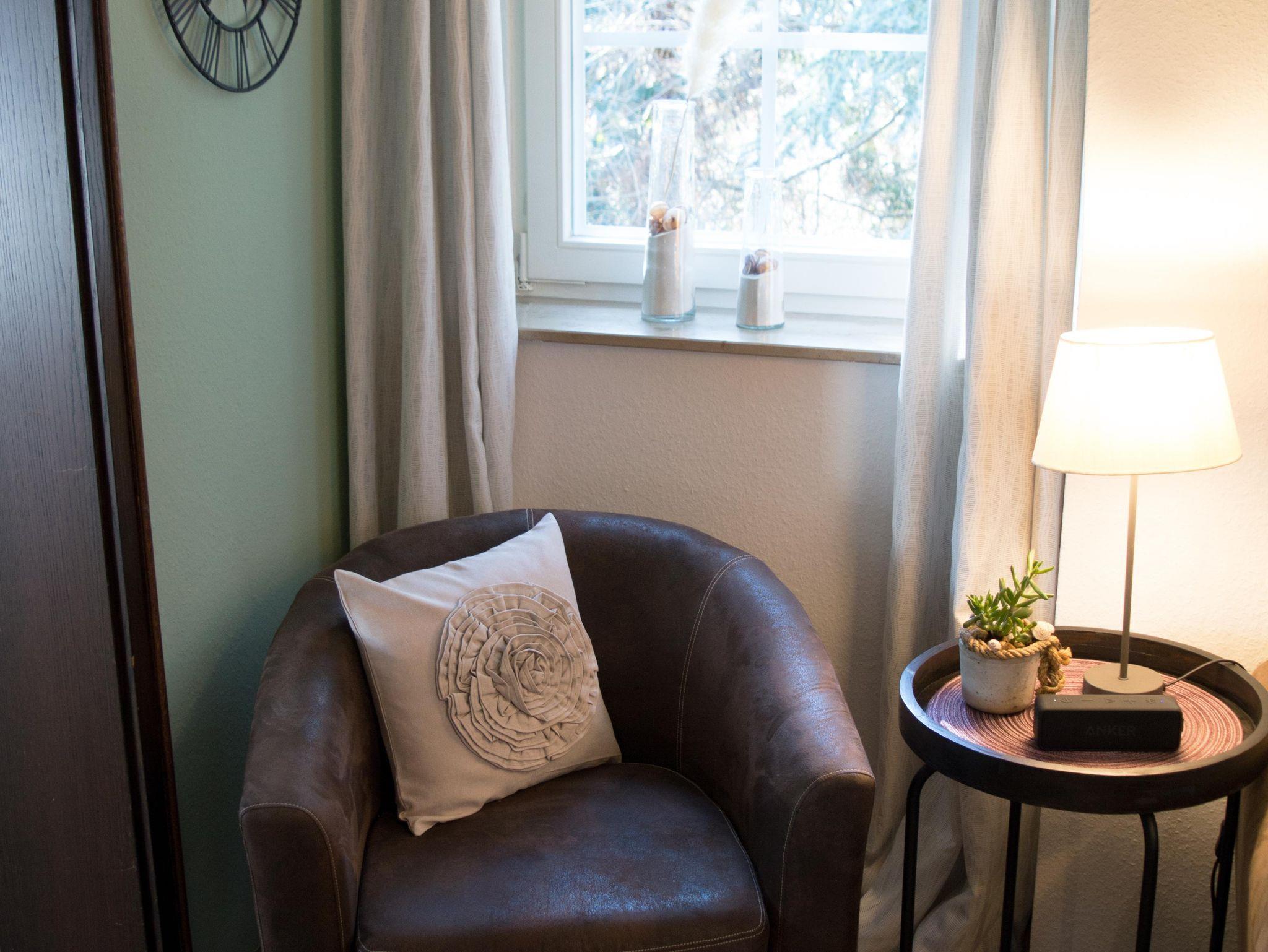 • Schlafzimmer mit Schrank, Stuhl u. Boxspringbett