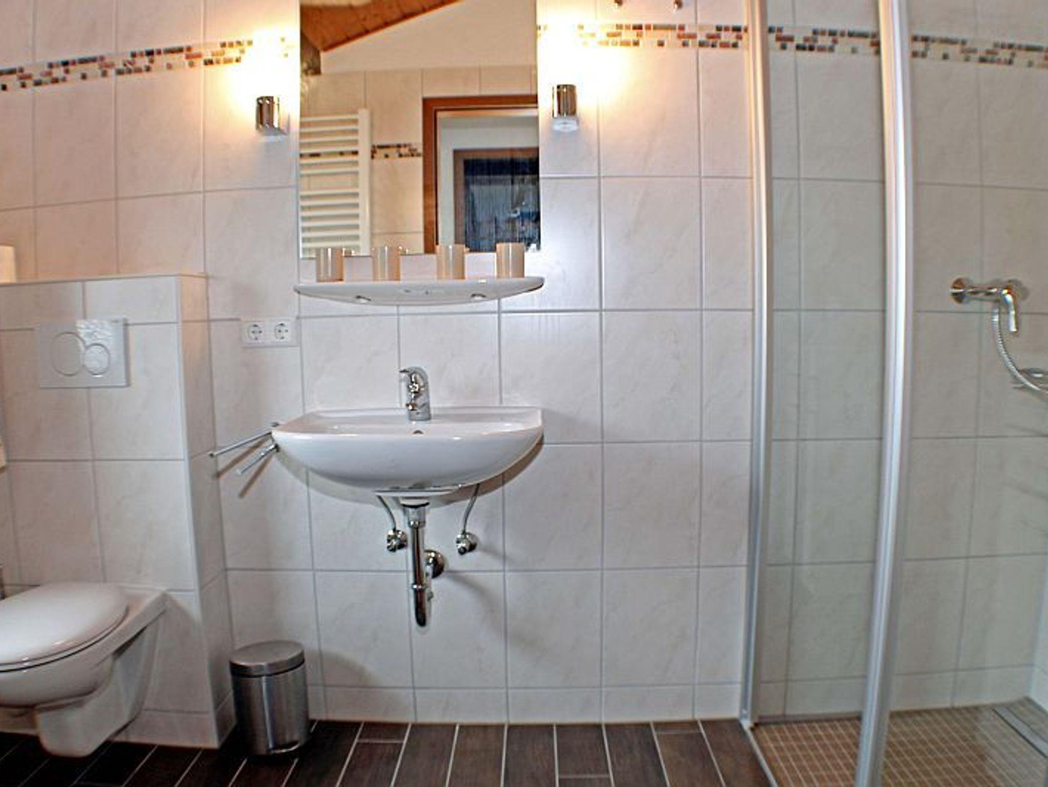 Geräumiges Bad mit ebenerdiger Dusche und WC, inkl. Badehocker, Kosmetikspiegel, Haarföhn und Verbandskasten.