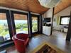 Wohnzimmer mit großem Panoramafenster und Fernblick auf die Alpen mit folgender Ausstattung: