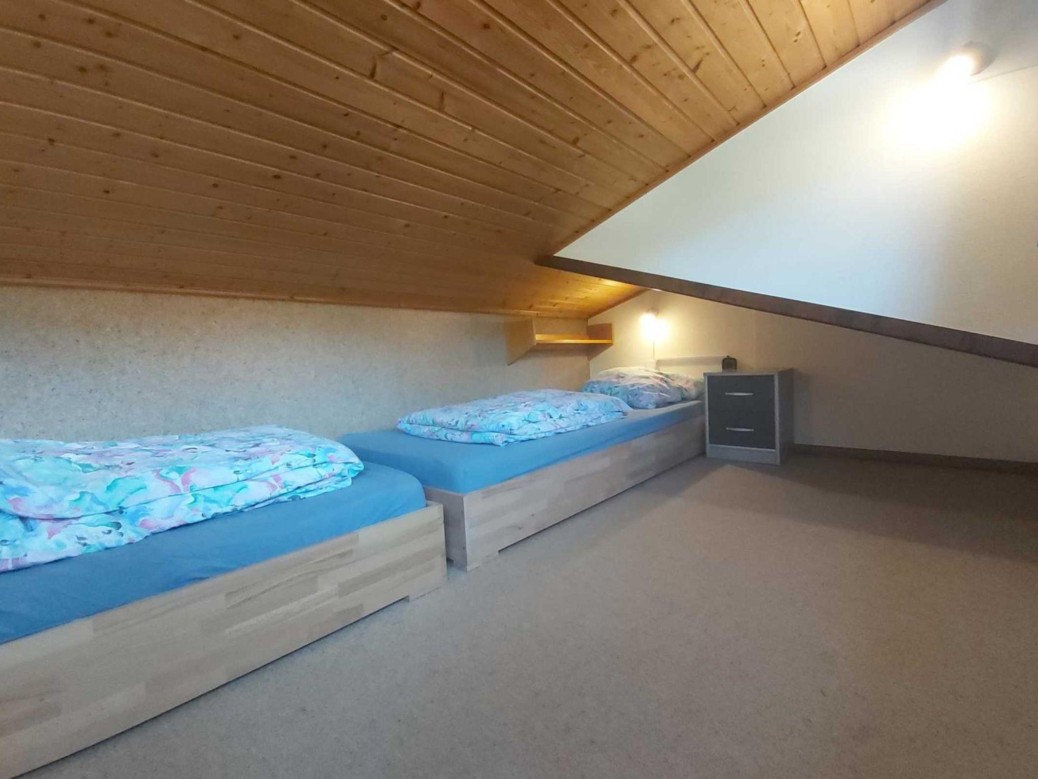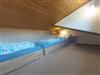 Das Ferienhaus verfügt über ein Schlafzimmer mit Doppelbett und einer Empore. In der Empore unter dem Satteldach, die durch eine Ausziehleitervom Flur aus zu erreichen ist, befinden sich zwei weitere Schlafplätze. Dies ist ein eigenes Reich für Kinder ab ca. 5 Jahren und für junge Leute.