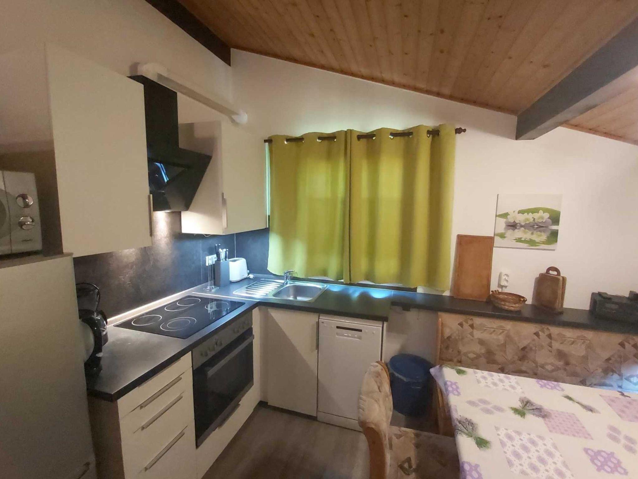 Die Küche verfügt über ein Cerankochfeld,Backofen, Geschirrspüler, Kühl-Gefrier-Kombination, Mikrowelle, Kaffeemaschine, Wasserkocher, Toaster und nach außen entlüftete Abzugshaube.