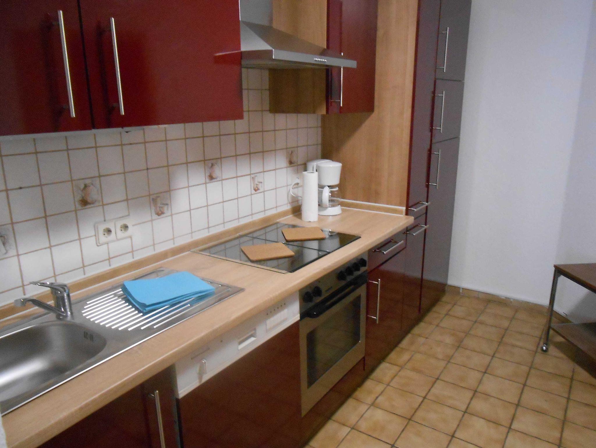 Schöne große Wohnung , 75 qm , mit Terrasse . großes Wohnzimmer , separate Küche , zwei Schlafzimmer , zwei Doppelbetten , Betten können auseinander gestellt und als Einzelbett genutzt werden , Bad mit WC / Dusche , Fenster , großer Farbfernseher , kostenloses WLAN , kostenloser Parkplatz beim Haus . Eingang über Terrasse möglich . Voll ausgestattete Küche mit Spülmaschine . Incl. Nebenkosten .