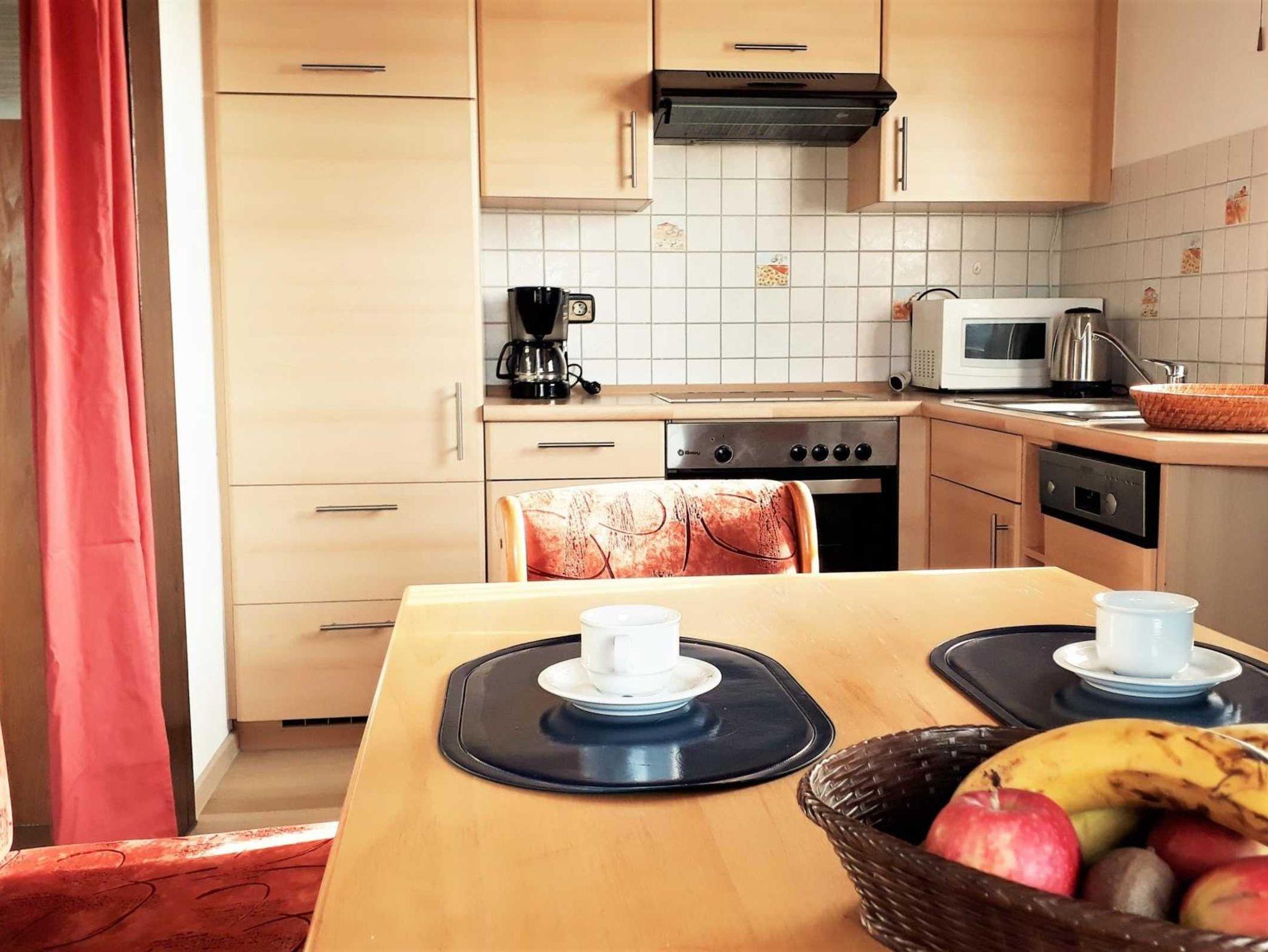 • Cerankochfeld, Backofen und Mikrowelle, Spülmaschine, Kühlschrank mit Gefrierfach, Kaffeemaschine, Toaster und Wasserkocher