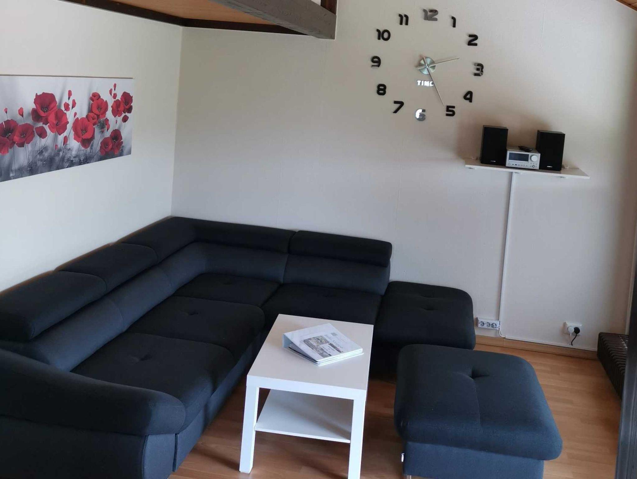 Das Wohnzimmer ist mit einer gemütlichen Couch, einem Radio (USB Anschluss, Bluetooth, DAB) und einem 43 '' Samsung Smart TV ausgestattet.