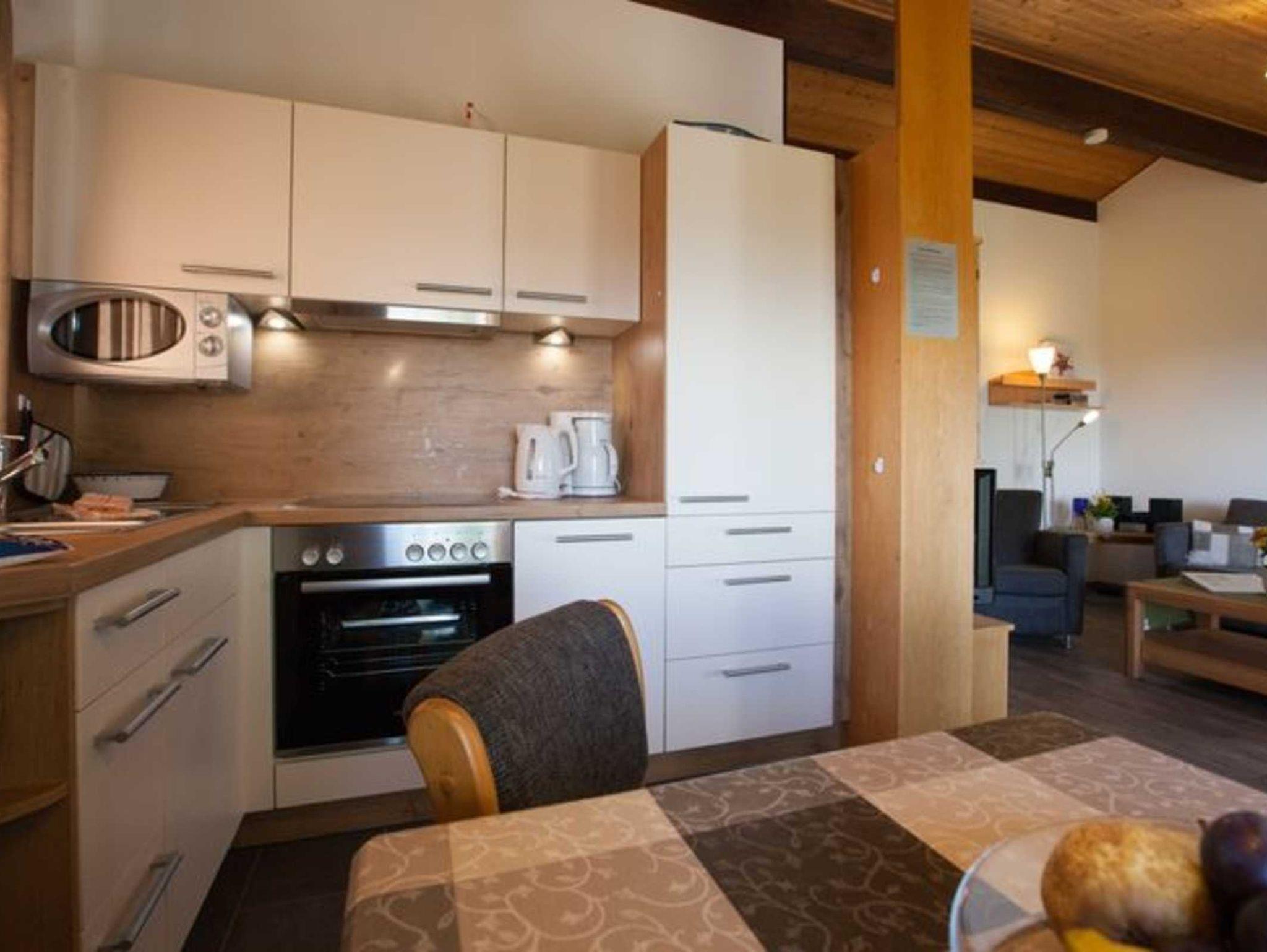 Die offene Küche ist bestens ausgestattet. In der Essecke kannst du es dir auf den Sitzbänken gemütlich machen. Neben einer Standardeinrichtung mit vier Herdplatten, Backofen und Kühlschrank inklusive Gefrierfach gibt es eine Mikrowelle mit Grillfunktion und eine Spülmaschine.