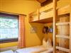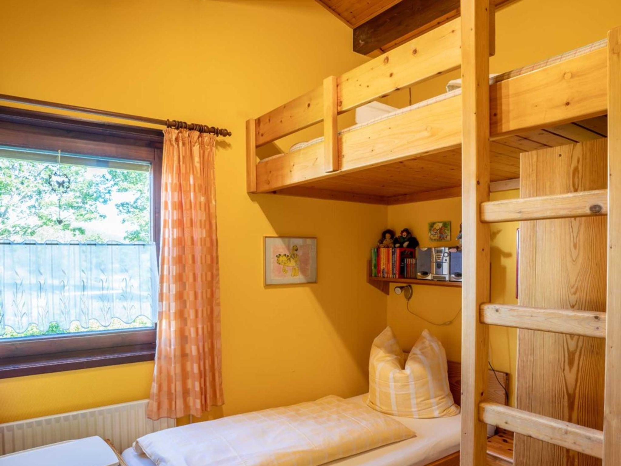 ein Schlafzimmer/Kinderzimmer mit einem Einzelbett und einem Hochbett, das über eine Leiter erreichbar ist, Fenster mit Rolladen.