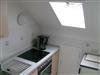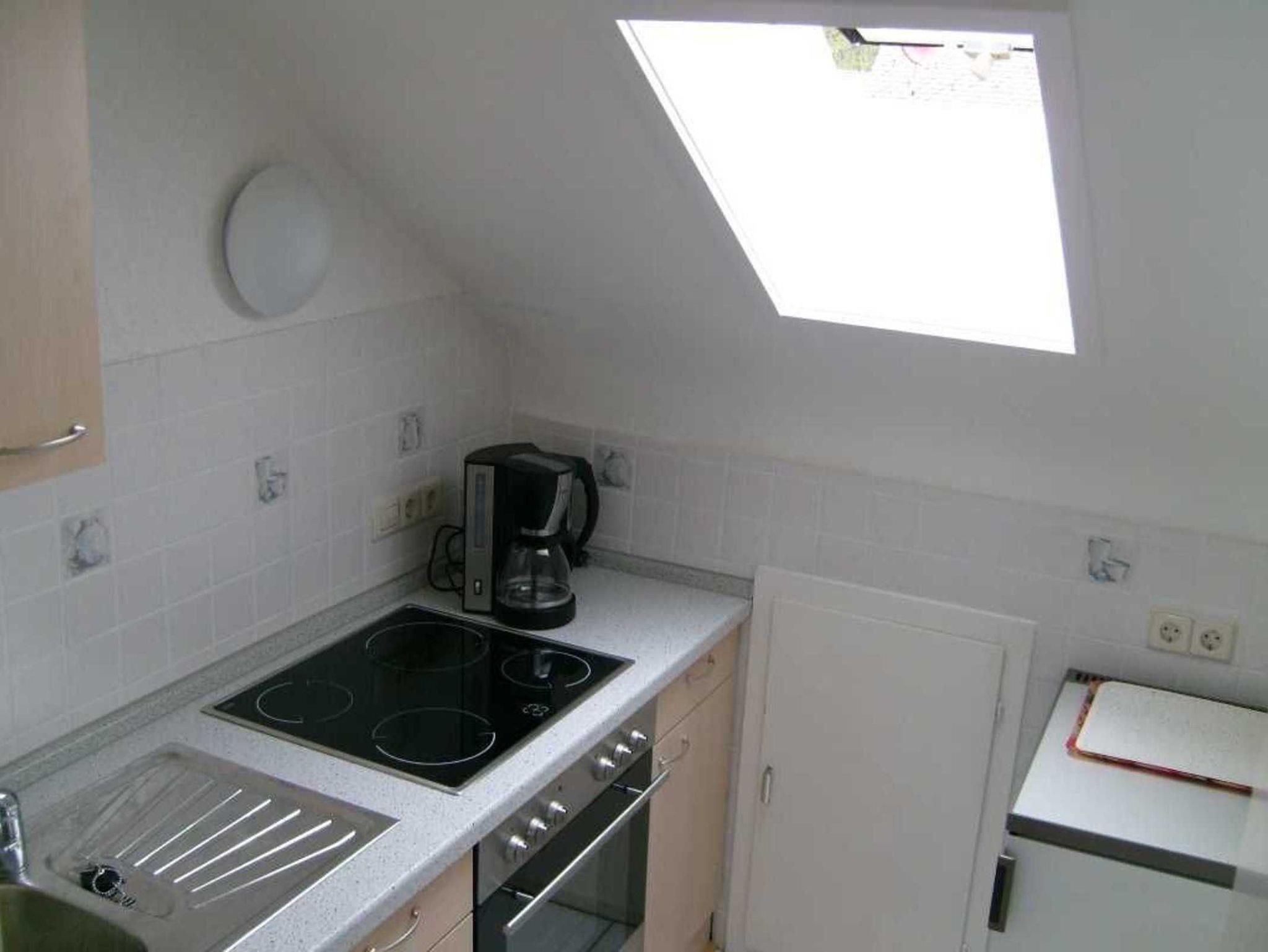 kleine Einbauküche mit Elektroherd , Kühlschrank mit Gefrierfach .