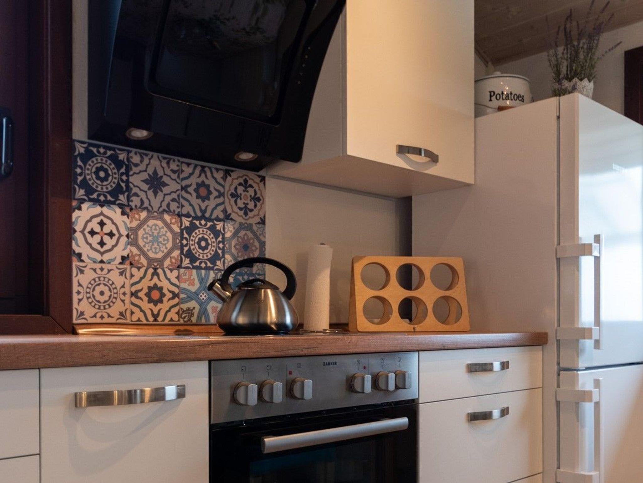Voll ausgestattete Küche mit Kaffeemaschine, Mikrowelle, Geschirrspülmaschine, Backofen
