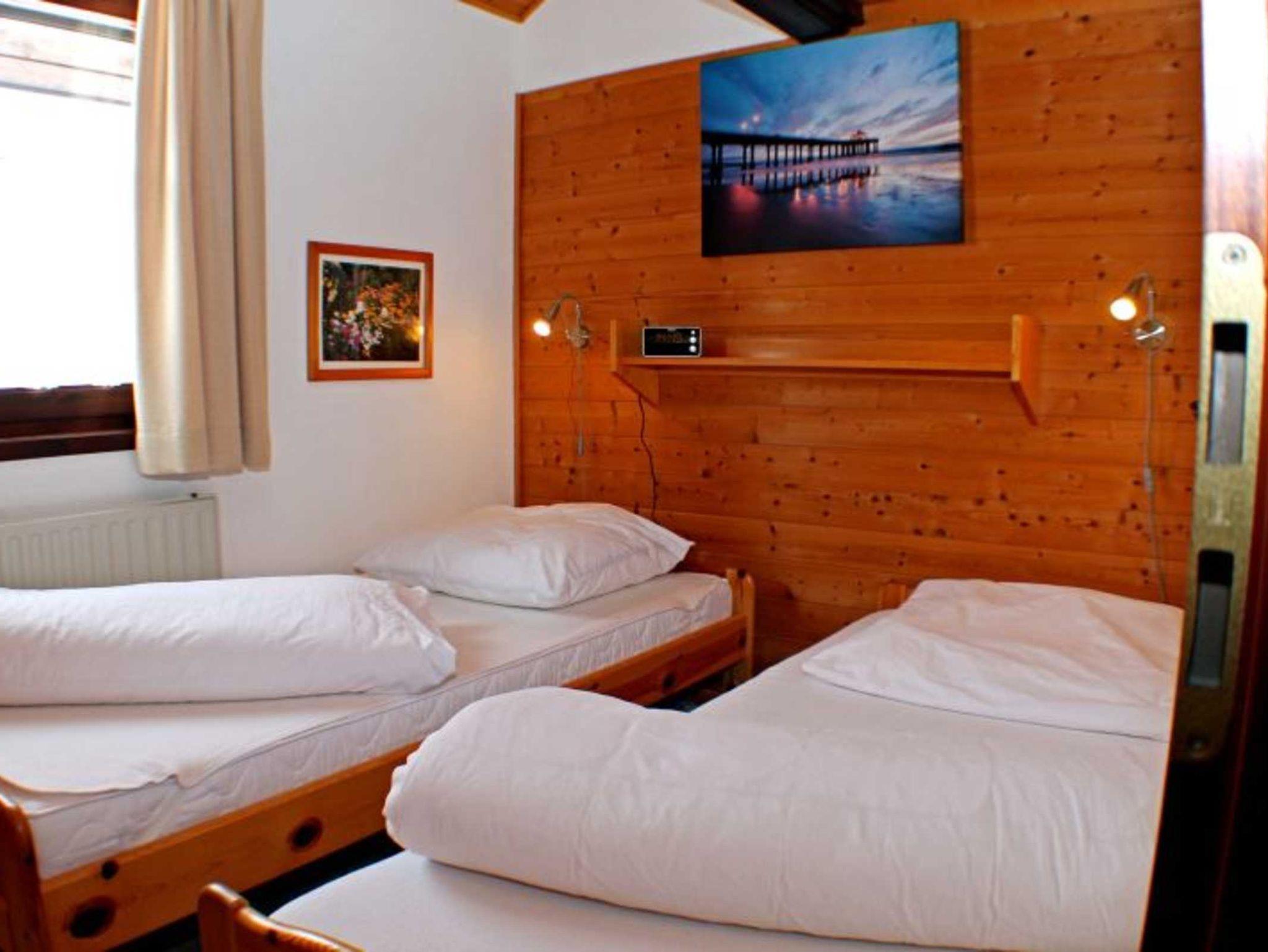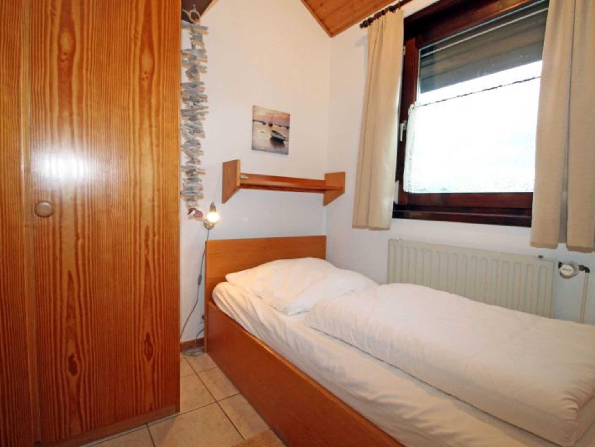 Das Ferienhaus verfügt über ein Schlafzimmer mit zwei getrennten aber auch zusammenschiebbaren Betten, 90 cm x 200 cm, höhenverstellbaren Lattenrosten, Ablage mit Funkwecker