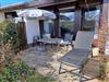 Die teilweise überdachte Terrasse ist möbliert (vier Stühle, Tisch, Sonnenschirm, zwei Relax-Liegen)
