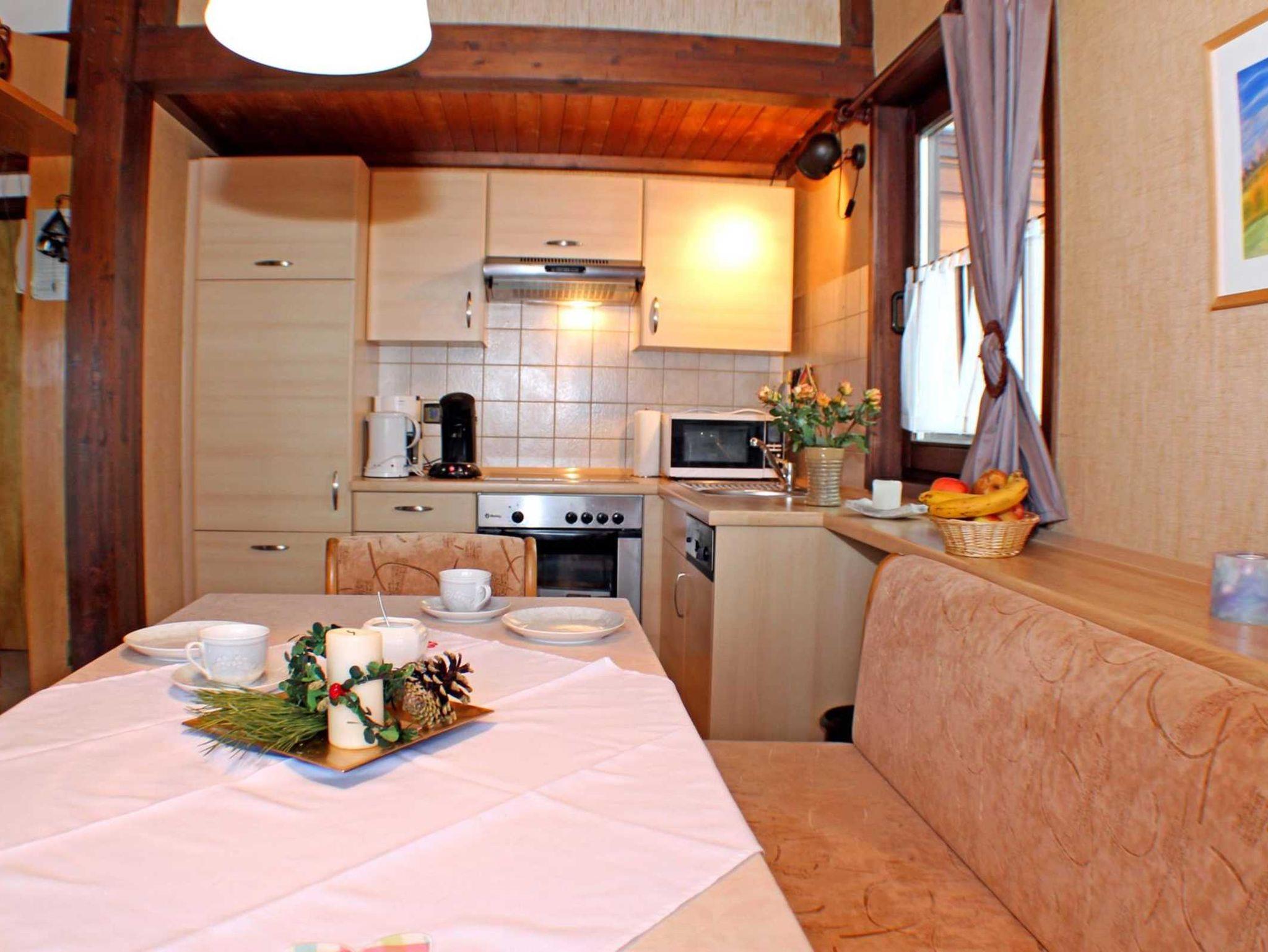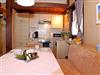 Zum Wohnraum gehört eine separate und geräumige Essecke sowie ein voll ausgestatteter Küchenbereich mit Geschirrspülmaschine, Cerankochfeld, Backofen, Kaffeemaschine sowie Senseo-Kaffeemaschine und Mikrowelle mit Grillfunktion.