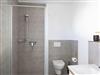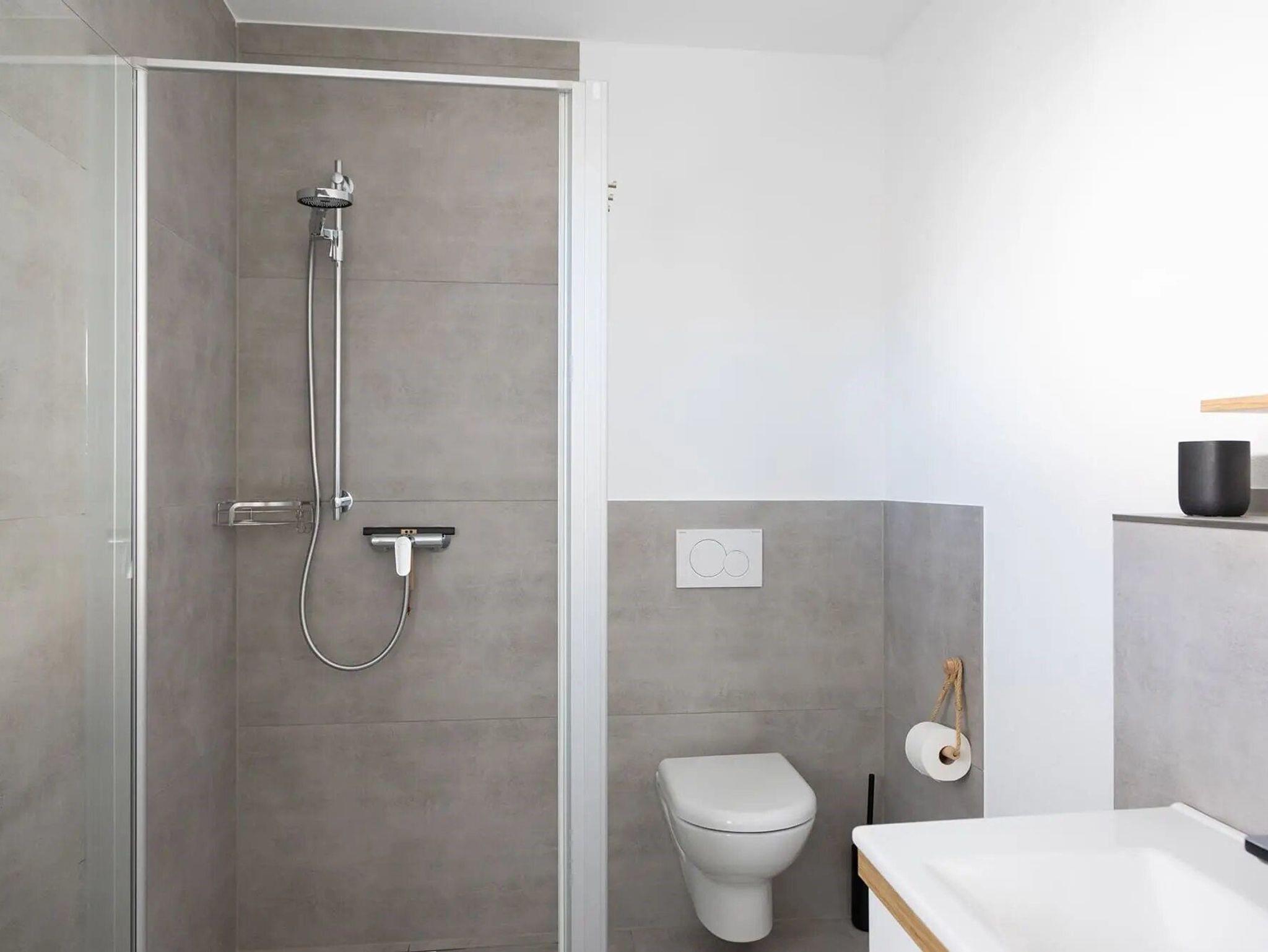 Das Badezimmer verfügt über eine ebenerdige Dusche.