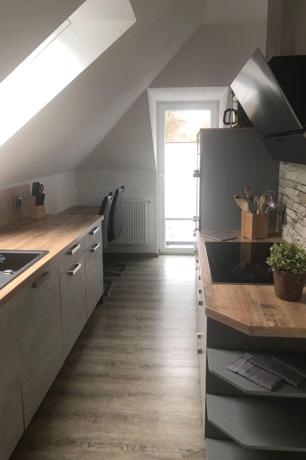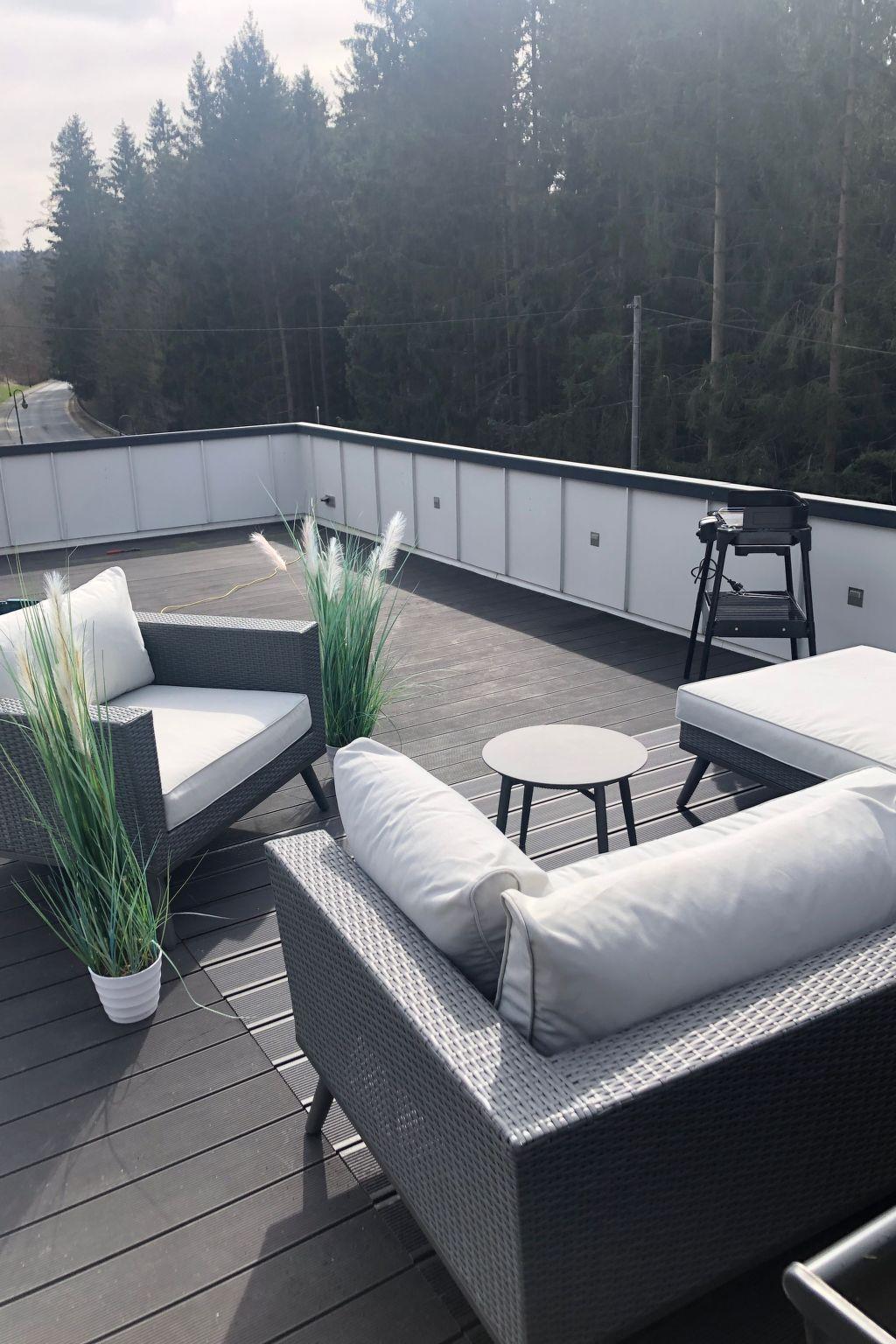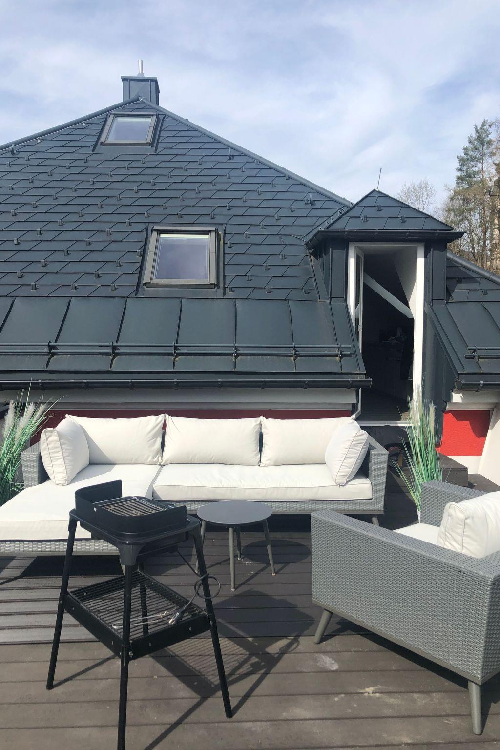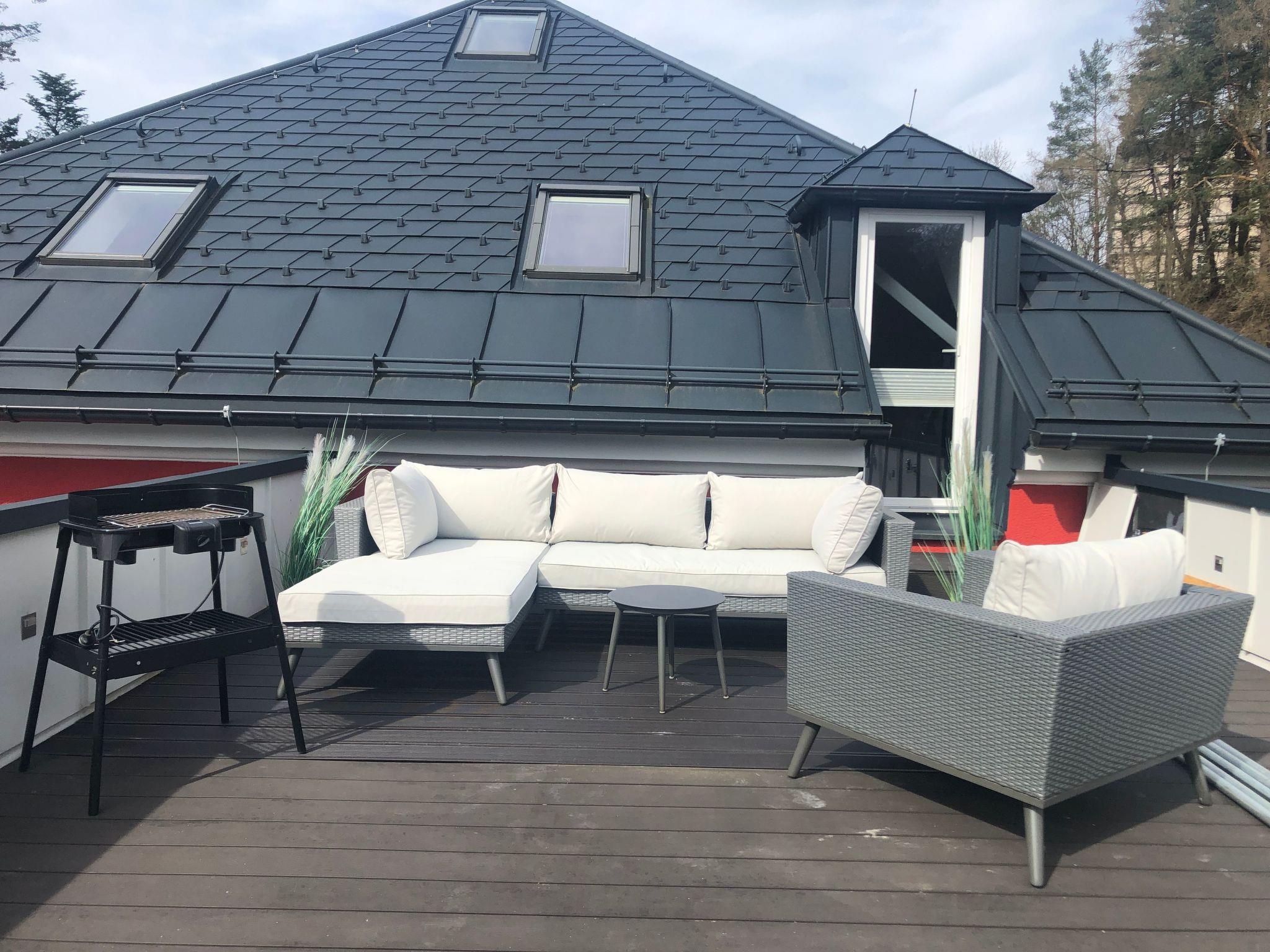 Von der vollausgestatteten Küche gelangt man direkt auf die traumhafte Dachterrasse mit Gartenmöbeln und Grill.