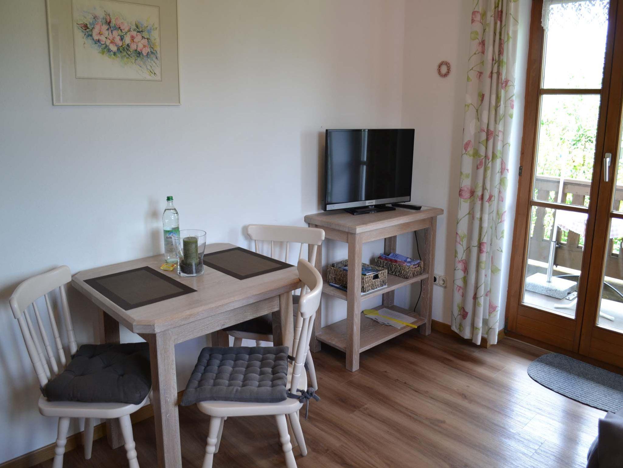 Gemütliche 2-Zimmerferienwohnung mit sonnigem Balkon, von dem aus Sie den Sonnenuntergang mit freiem Blick auf Berge, Wald und Wiesen genießen können. Komplett ausgestattete Küche mit Geschirrspüler, Mikrowelle incl. Grill, Kühlschrank mit Gefrierfach, Kaffeemaschine und vieles mehr. Im Schlafzimmer finden Sie verstellbare Lattenroste, Verdunklungsvorhänge und Bettwäsche. Ein Bad mit Dusch- und Handtüchern, sowie Kosmetikspiegel, Fön und diverse Sanitärartikel steht Ihnen zur Verfügung. Selbstverständlich auch ein Flachbildfernseher (Sat-TV), kostenloses WLAN und CD-Radio. Nichtraucher Ferienwohnung (Rauchen ist auf dem Balkon gestattet).