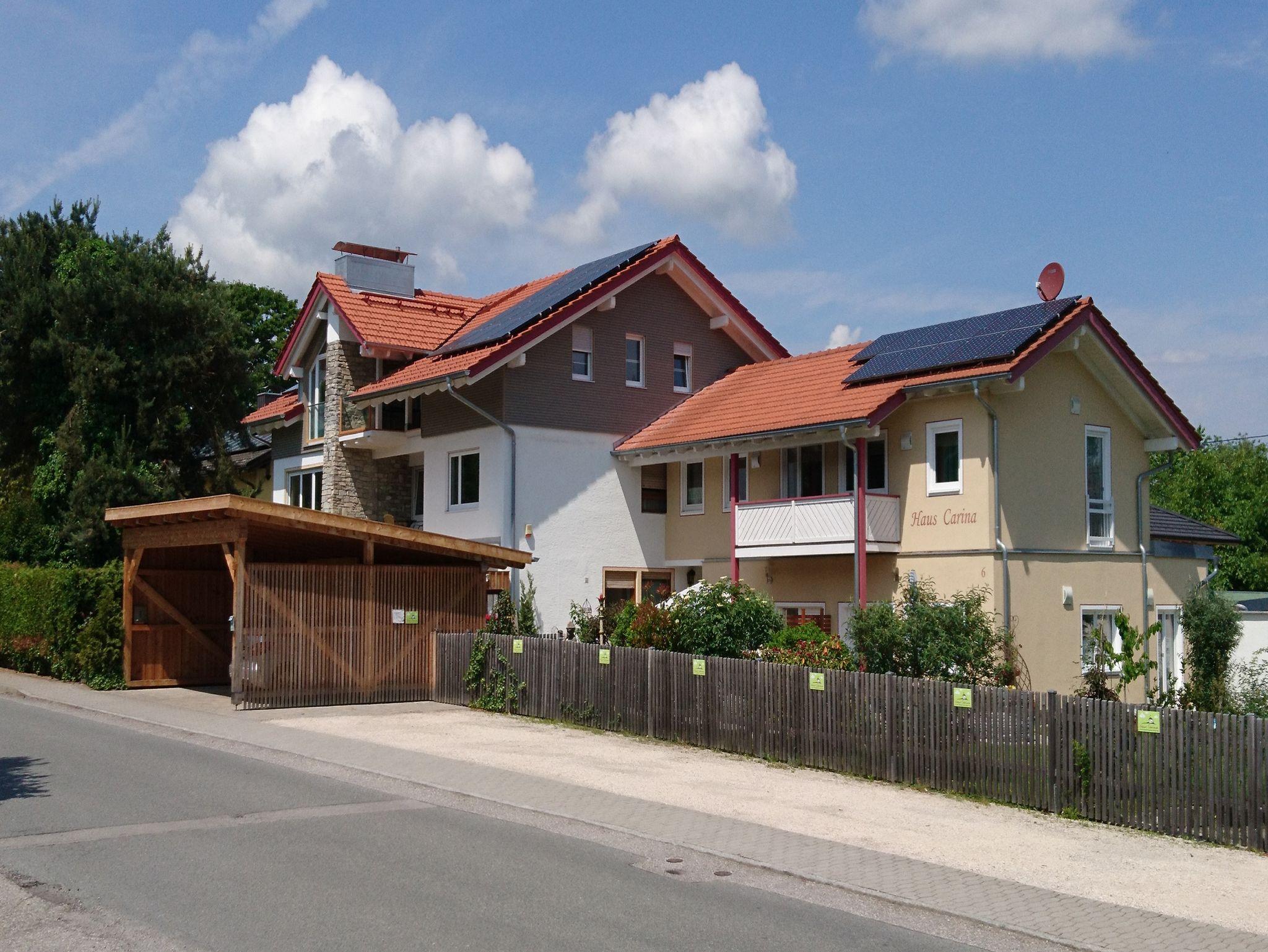 Die Familie Edenhofer heißt Sie herzlich Willkommen im Ferienhaus Carina. Die ehemalige Handweberei wurde von uns liebevoll in ein perfektes Urlaubsdomizil für aktive oder ruhesuchende Urlauber verwandelt. Der mit viel Liebe zum Detail angelegte Ziergarten empfängt Sie zu jeder Jahreszeit mit seinem Blütenmeer. Neben Stauden und Gehölzen findet sich hier auch ein gemauerter Brunnen, junge Obstbäume und eine gepflegte Liegewiese. Unsere Gäste erwartet ein neugestaltetes Haus, das in den Jahren 2012 und 2018 behutsam und unter Beachtung ökologischer Aspekte erweitert wurde. Die Dachgeschosse sind in Holzständer-Bauweise ausgeführt und wurden mit Holzfaserplatten gedäi uns arbeitet eine nachhaltige, aktuelle Holzpellet-Heizung, die ganz ohne fossile Brennstoffe für warme Räume und heißes Duschwasser sorgt. An sonnigen Tagen trägt auch die vorhandene Solaranlage zur umweltfreundlichen Wassererwärmung bei.Eine zeitgemäße Photovoltaikanlage versorgt alle Wohnungen tagsüber mit grünem Strom. Sie können uns bei der Reduzierung von weniger umweltverträglich produziertem Strom unterstützen, indem Sie die Spülmaschine vorzugsweise tagsüber laufen lassen.Auch ein Urlaub vom Auto ist bei einem Aufenthalt in unserem Haus denkbar. Möglich macht dies die hervorragende Anbindung an den Bahnverkehr( es verkehren stündlich Züge nach München und Salzburg) sowie die zentrale Lage im Ort (Therme und Einkaufsmöglichkeiten innerhalb weniger Minuten zu Fuß erreichbar). Für Ihre mitgebrachten Fahrräder steht ein großer absperrbarer Radlschuppen zur Verfügung.Unsere Hausgäste erhalten in der Chiemgauer Weberei 10 % Nachlass auf Handwebteppiche und andere wollige Artikel aus dem Geschenkeladen in Ströbing 13. Zu den üblichen öffnungszeiten darf gerne ein Blick in die Produktion geworfen werden. Wir bieten auf Anfrage auch Führungen für Gruppen an. Bitte beachten Sie, dass unsere Unterkunft nur an Urlaubsgäste vermietet wird. Wir bitten um Verständnis, dass eine Vermietung an Arbeiter, Monteure, etc. nicht möglich ist.