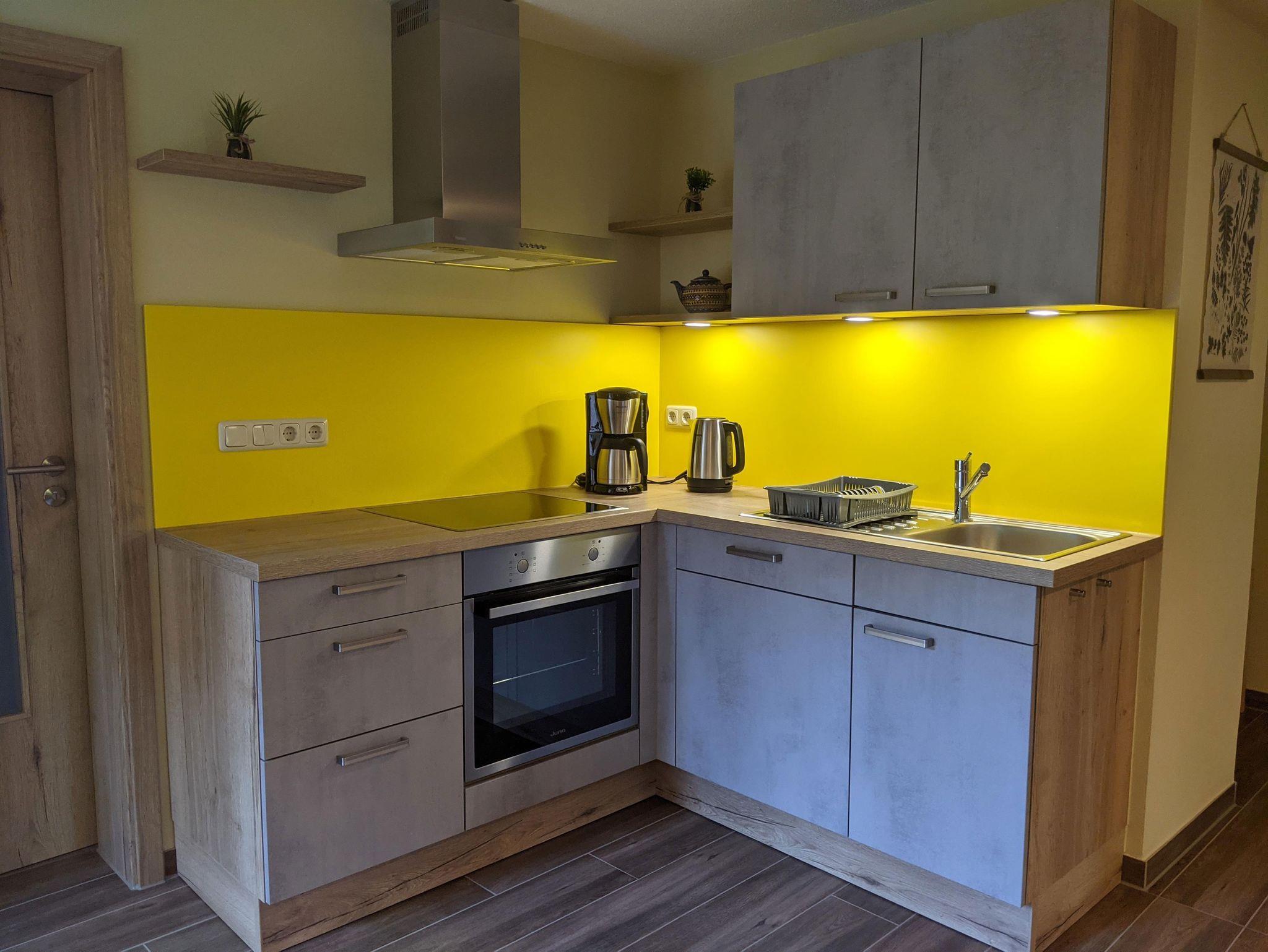 Die voll ausgestattete Küche umfasst neben einer Kühl-/ Gefrierkombination auch Toaster, Wasserkocher, Kaffeemaschine, Induktionskochfeld, Backofen sowie Geschirrspüler. Eine Terrasse, umgeben von Blumen, lädt zu gemütlichen Frühstücks- oder Abendessen im ländlichen Ambiente ein.