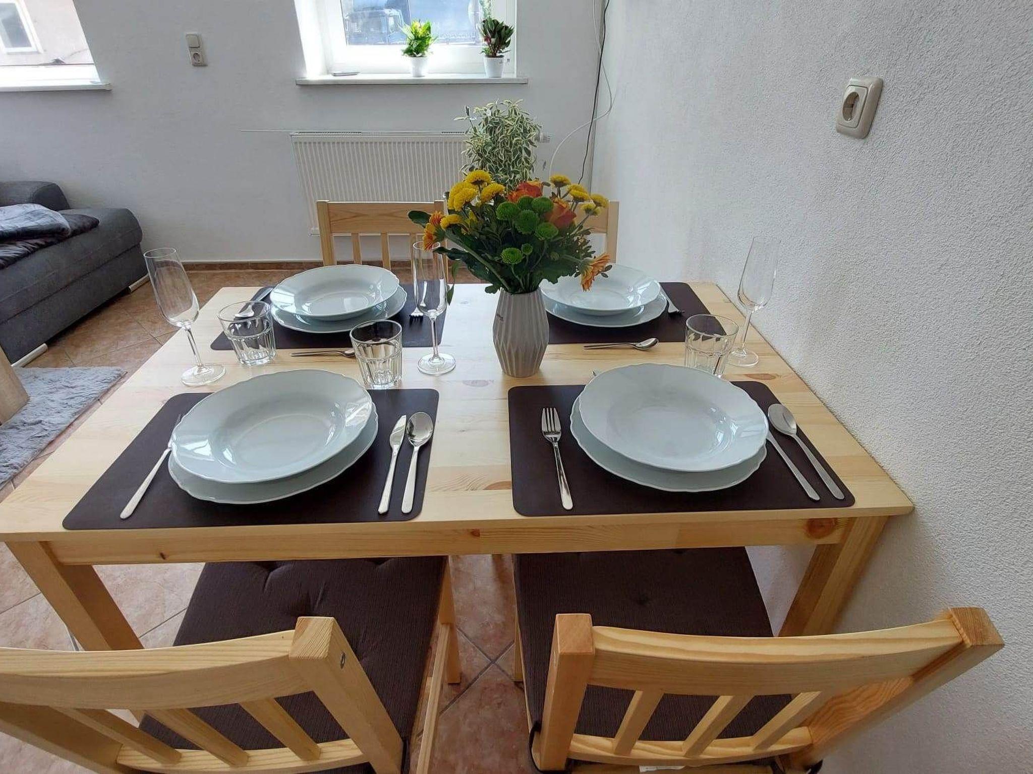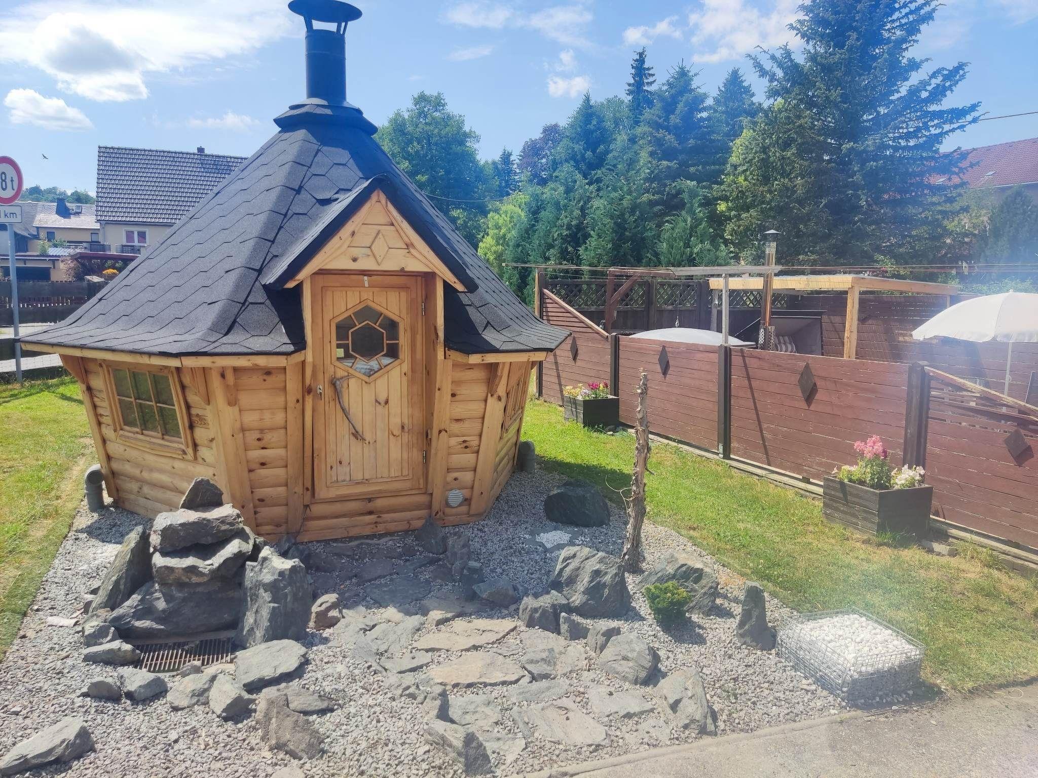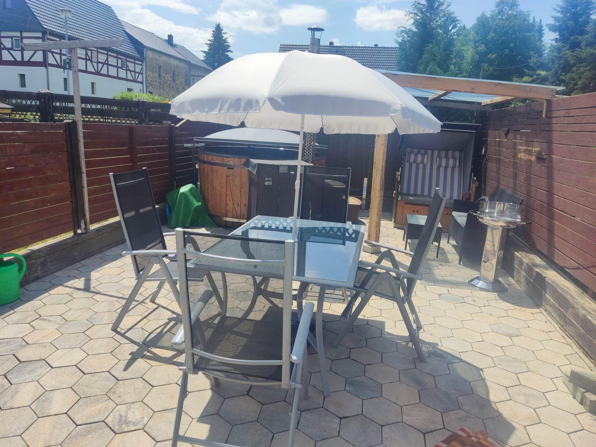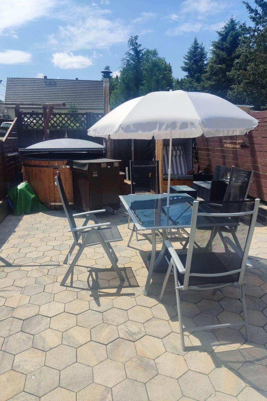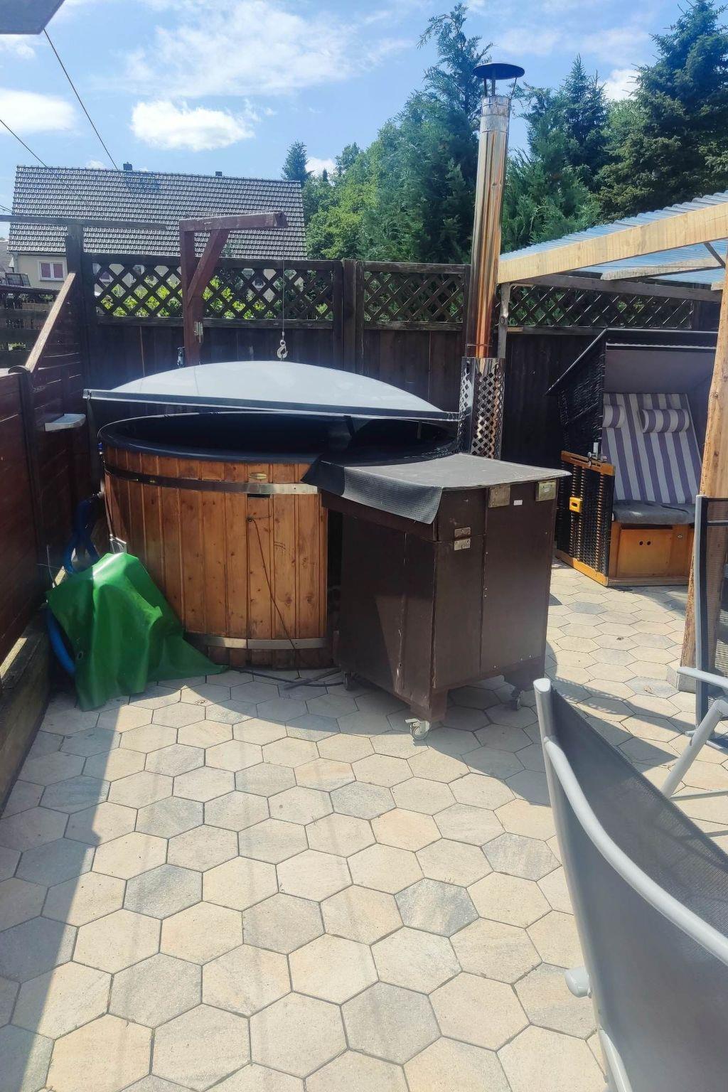 Ferienwohnung im Grünen mit Jacuzzi und Whirlpool Funktion. Die gemütlich eingerichtete Ferienwohnung befindet sich im Erdgeschoss, umgeben von einem schönen Garten, Terrasse mit Sonnenliegen, Grillmöglichkeit, PKW-Stellplatz und Spielmöglichkeiten für Kinder. Die voll ausgestattete Wohnung verfügt über 1-2 Schlafzimmer mit Fußbodenheizung, Küche, Wohnzimmer und ein Badezimmer mit Wanne, Dusche, WC, Föhn, Trockner und Waschmaschine. Ebenso ist ausreichend Stauraum für Handtücher. Handtücher, Duschtücher und Bettwäsche stellen wir ihnen zur Verfügung. Sollten sie während ihres Aufenthaltes Wechselhandtücher benötigen, sprechen Sie uns einfach an. Des Weiteren können wir die Wohnung mit einem Stühlchen für Kleinkinder, Baby, Kleinkinderbett, Rausfallschutz, Wickelauflage und einem Töpfchen ausstatten. Im Flur befindet sich eine Garderobe mit Schuhregal, Schuhlöffel und Schirm. Zur Ausstattung der Küche zählen unter anderem ein Herd, Ceranfeld, Backofen, Wasserkocher, Kühlschrank, Mikrowelle, Kaffeemaschine und ein Toaster Töpfe, Pfannen, Mixer, Geschirr und Gläser aller Art. Ebenfalls finden Sie Kaffee, Tee und Zubehör für Ihre erste Tasse Kaffee, Tee nach einer anstrengenden Anreise. Im Schlafzimmer erwartet Sie ein Boxspringbett (180 x 200 cm), ein geräumiger Kleiderschrank mit einer großen Kommode und ein weiterer TV. In der Ferienwohnung können bis zu vier Personen ihren erholsamen Urlaub genießen. Sie ist ca. 55 qm groß und beinhaltet einen Wohn-; Schlafraum mit Couch, Schlafcouch. Das Wohnzimmer lädt mit Sofa, sowie TV mit Streamingdiensten (Bsp. Netflix, Disney+) zum Verweilen oder für gemütliche Spielabende ein. Gesellschaftsspiele liegen für die gemeinschaftliche Nutzung griffbereit. Romantische Abende könnt ihr vor dem Kamin genießen.