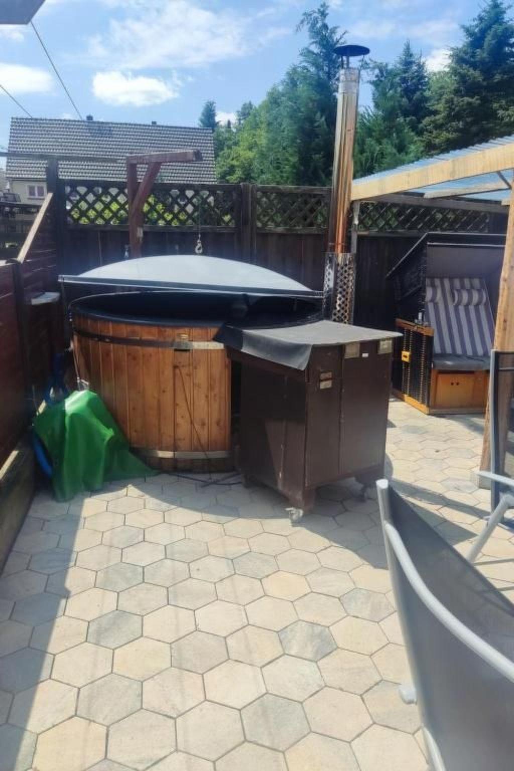 Ferienwohnung im Grünen mit Jacuzzi und Whirlpool Funktion. Die gemütlich eingerichtete Ferienwohnung befindet sich im Erdgeschoss, umgeben von einem schönen Garten, Terrasse mit Sonnenliegen, Grillmöglichkeit, PKW-Stellplatz und Spielmöglichkeiten für Kinder. Die voll ausgestattete Wohnung verfügt über 1-2 Schlafzimmer mit Fußbodenheizung, Küche, Wohnzimmer und ein Badezimmer mit Wanne, Dusche, WC, Föhn, Ebenso ist ausreichend Stauraum für Handtücher. Handtücher, Duschtücher und Bettwäsche stellen wir ihnen zur Verfügung. Sollten sie während ihres Aufenthaltes Wechselhandtücher benötigen, sprechen Sie uns einfach an. Des Weiteren können wir die Wohnung mit einem Stühlchen für Kleinkinder, Baby, Kleinkinderbett, Rausfallschutz, Wickelauflage und einem Töpfchen ausstatten. Im Flur befindet sich eine Garderobe mit Schuhregal, Schuhlöffel und Schirm. Zur Ausstattung der Küche zählen unter anderem ein Herd, Ceranfeld, Backofen, Wasserkocher, Kühlschrank, Mikrowelle, Kaffeemaschine und ein Toaster Töpfe, Pfannen, Mixer, Geschirr und Gläser aller Art. Ebenfalls finden Sie Kaffee, Tee und Zubehör für Ihre erste Tasse Kaffee, Tee nach einer anstrengenden Anreise. Im Schlafzimmer erwartet Sie ein Boxspringbett (180 x 200 cm), ein geräumiger Kleiderschrank mit einer großen Kommode und ein weiterer TV. In der Ferienwohnung können bis zu vier Personen ihren erholsamen Urlaub genießen. Sie ist ca. 55 qm groß und beinhaltet einen Wohn-; Schlafraum mit Couch, Schlafcouch. Das Wohnzimmer lädt mit Sofa, sowie TV mit Streamingdiensten (Bsp. Netflix, Disney+) zum Verweilen oder für gemütliche Spielabende ein. Gesellschaftsspiele liegen für die gemeinschaftliche Nutzung griffbereit. Romantische Abende könnt ihr vor dem Kamin genießen.