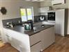 -offene Küche mit Backofen, Kühlschrank, Kaffeemaschine, Wasserkocher, Toaster