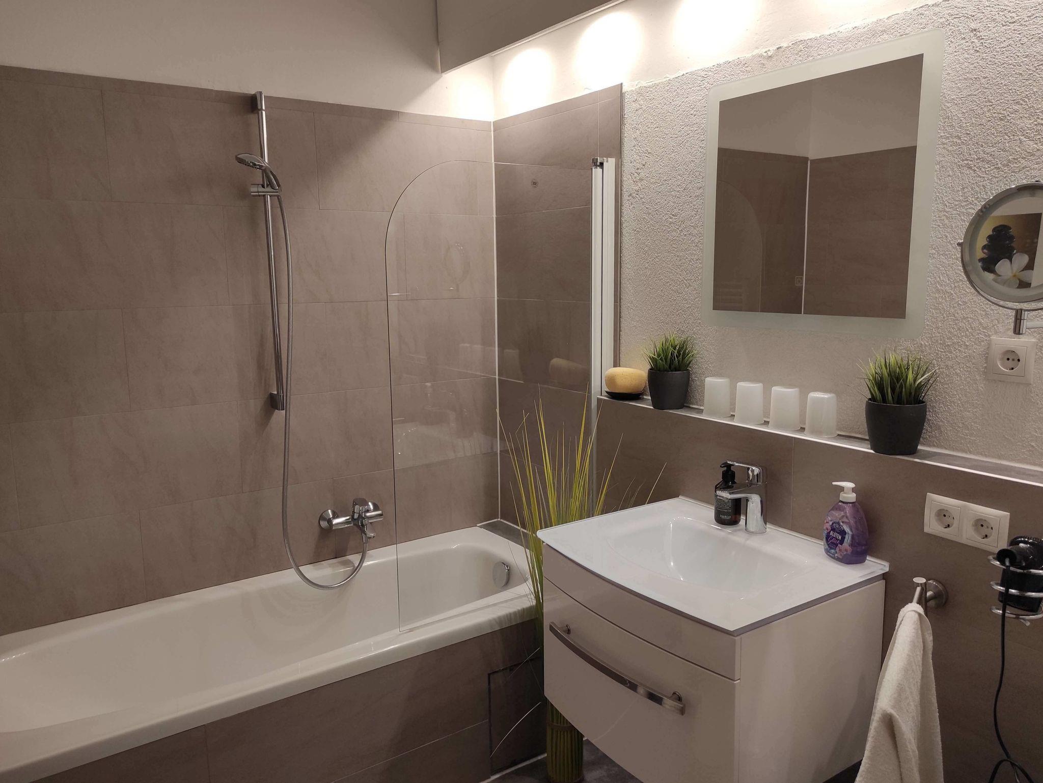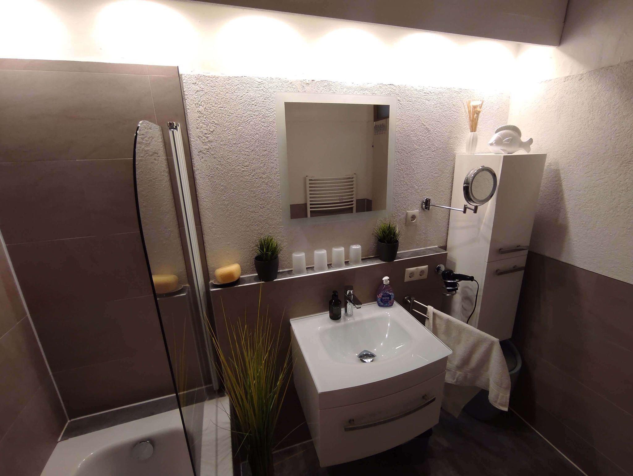 Die Fewo verfügt über 1 modernes Bad mit einer Badewanne mit Duschmöglichkeit, einem Handuchtrockner und WC.