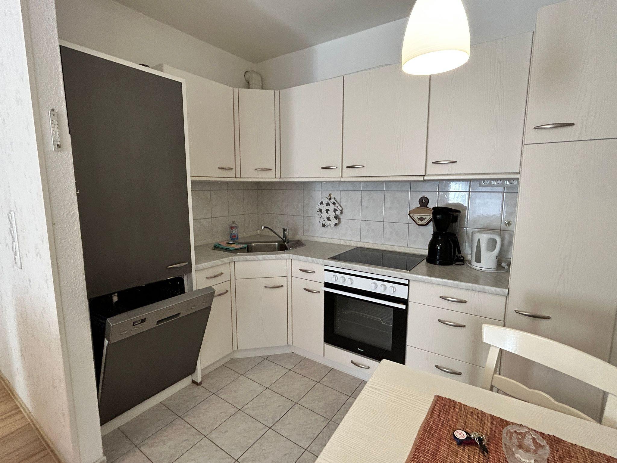 In der Kochnische finden Sie einen Herd mit Backofen, Dunstabzugshaube, Kaffeemaschine, Wasserkocher und Kühlschrank mit Gefrierfach, Geschirrspülmaschine.