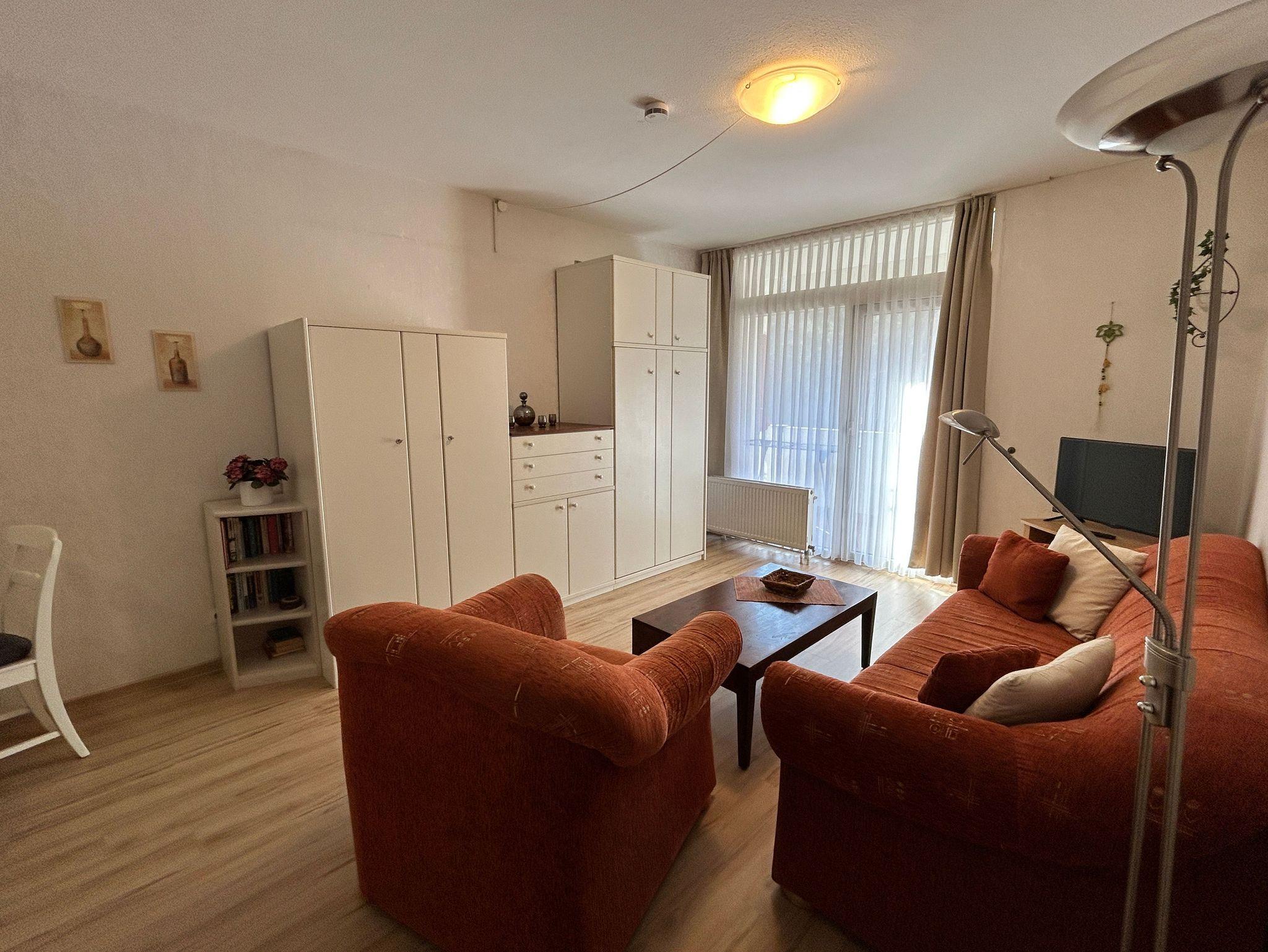 Im Wohnzimmer finden Sie eine gemütliche Couch, einen Sessel, einen Flachbild - Fernseher und eine Stereoanlage sowie das Schrankbett für die 3. Person