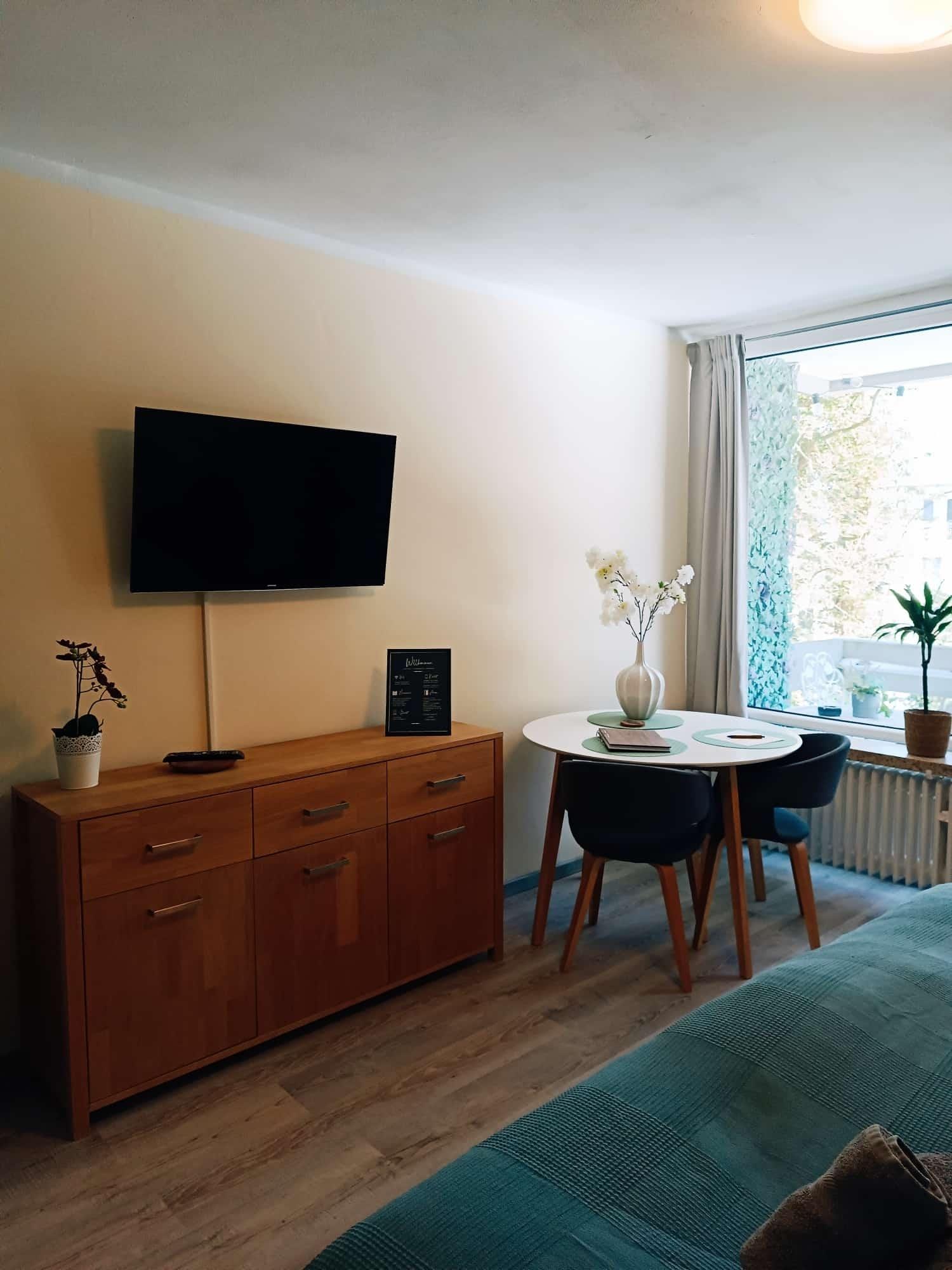 Die Einraumwohnung bietet ein modernes Boxspringbett für erholsamen Schlaf sowie einen Balkon mit einem herrlichen Blick auf die umliegenden Bäume und Berge. Eine voll ausgestattete Küche mit Kochplatten, Kühlschrank, Mikrowelle, Toaster, Wasserkocher und Minibackofen steht Ihnen zur Verfügung. Außerdem sind Bettwäsche und Handtücher im Preis inbegriffen. Für zusätzlichen Komfort gibt es einen eigenen Parkplatz, einen Fahrradraum sowie eine gebührenpflichtige Waschmaschine im Keller.