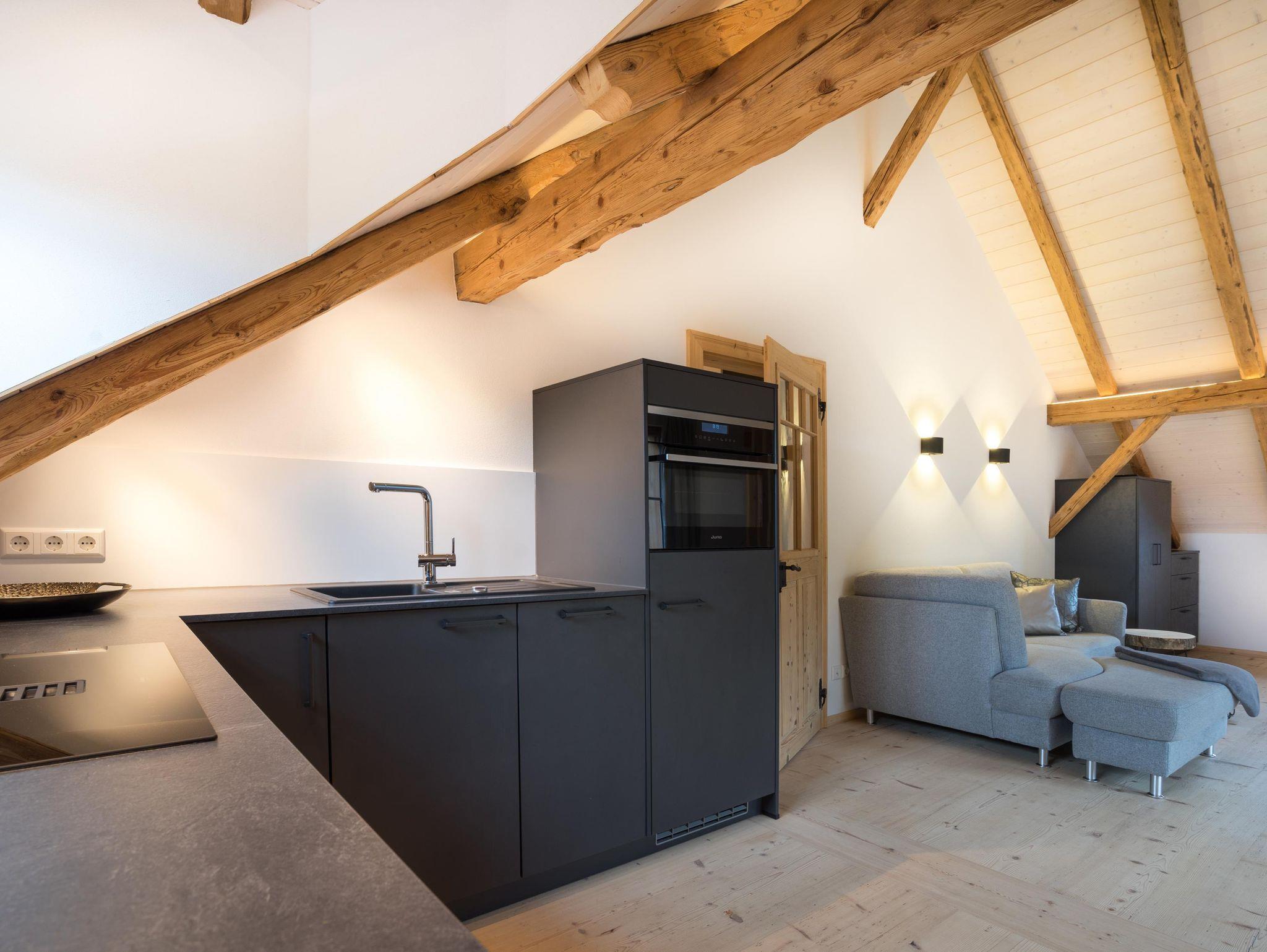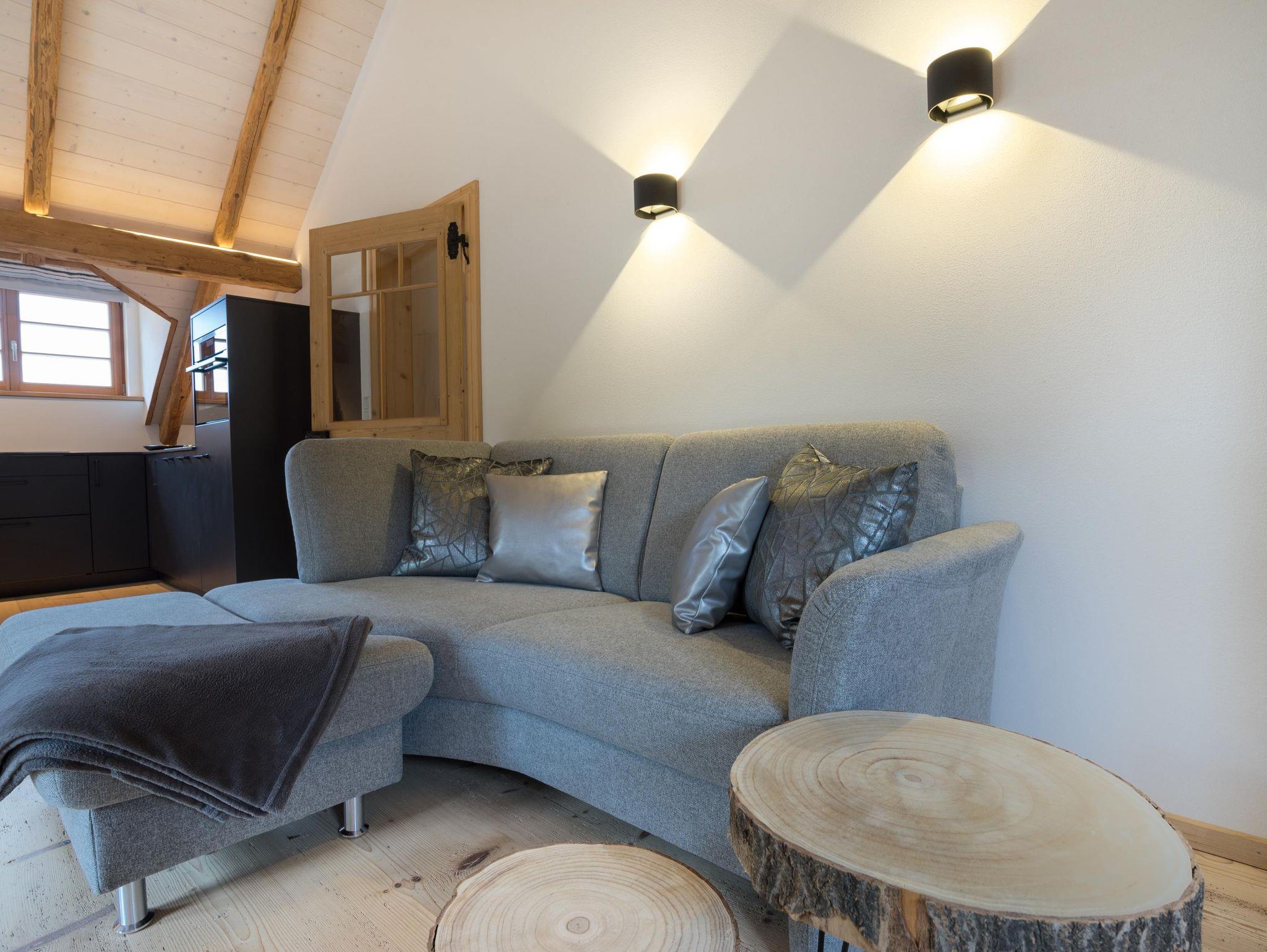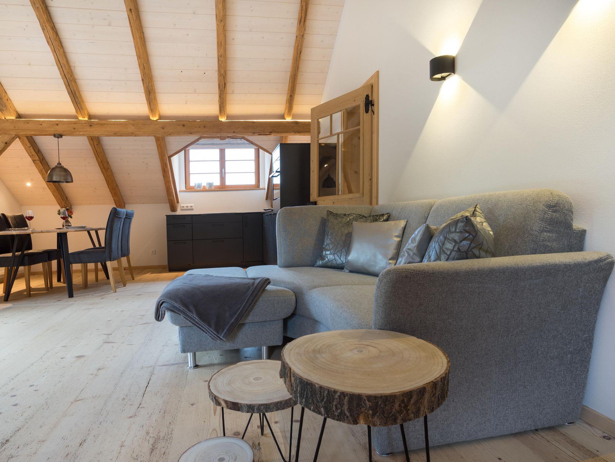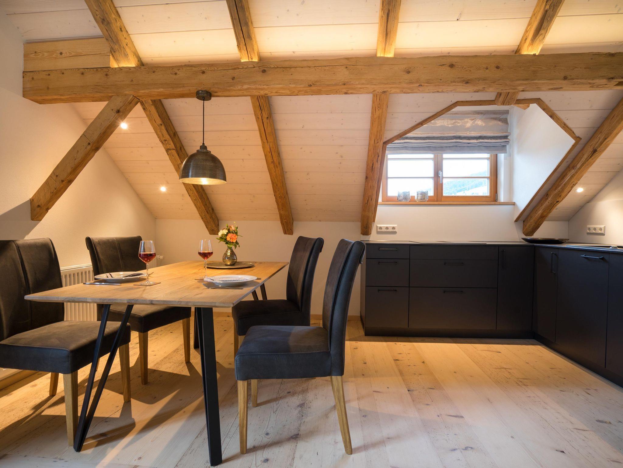 Unsere Dachgeschoss Wohnung ist mit allem ausgestattet, was Sie für einen komfortablen Aufenthalt benötigen. Der Wohn-Schlafraum verfügt über ein Doppelbett, einen Essbereich sowie eine voll ausgestattet Küche. Alles im schönen modernen Holzoptik-Design. Im Wohnbereich können Sie vom Sofa aus den Blick auf die Berge genießen. Eine überdachte Sitzlounge lädt zum Entspannen und Ausklingen des Abends ein.