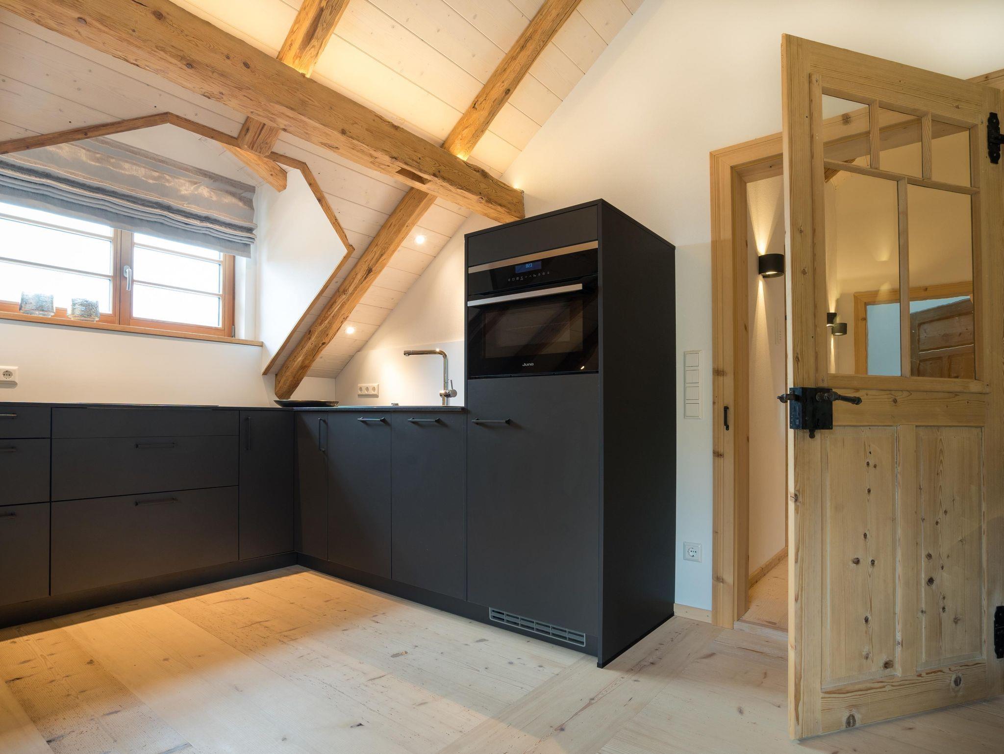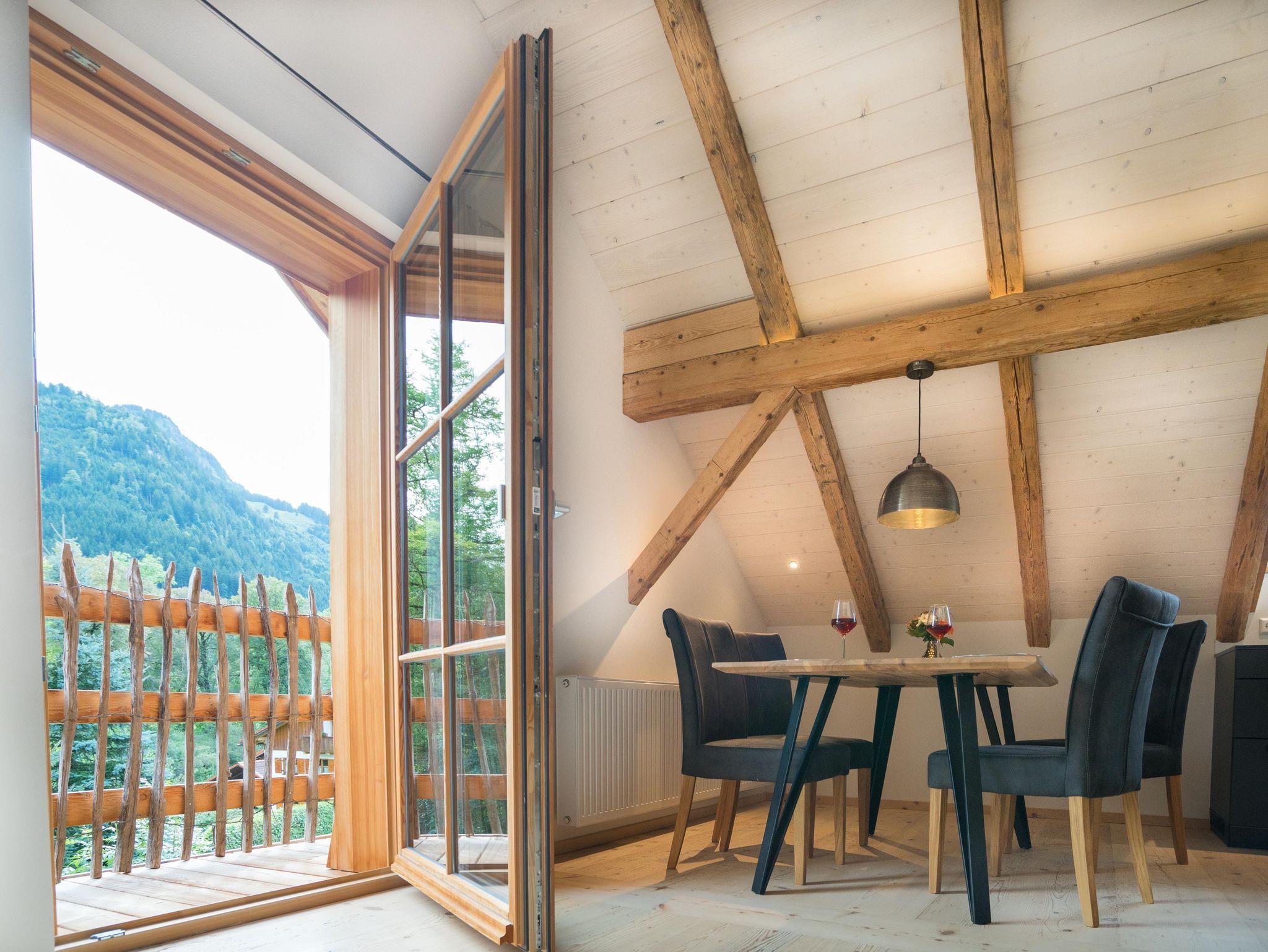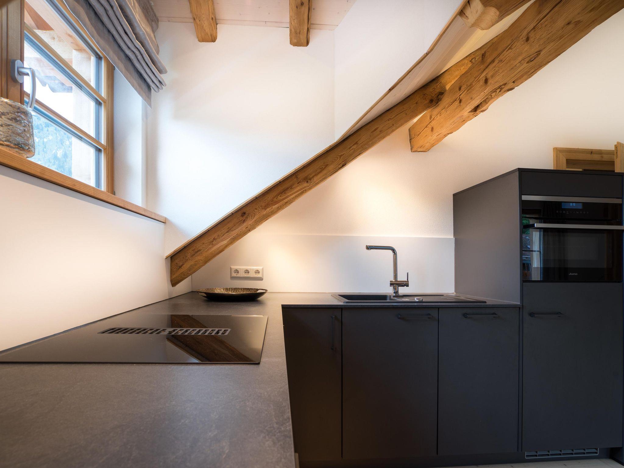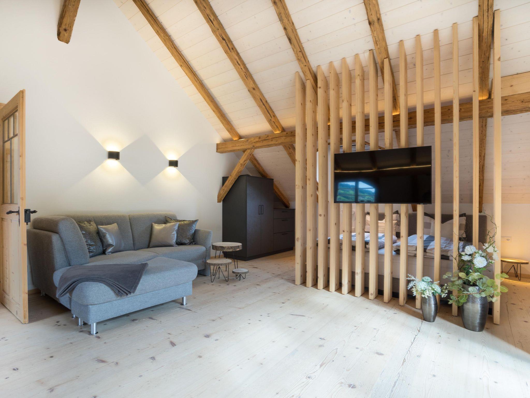 Unsere Dachgeschoss Wohnung ist mit allem ausgestattet, was Sie für einen komfortablen Aufenthalt benötigen. Der Wohn-Schlafraum verfügt über ein Doppelbett, einen Essbereich sowie eine voll ausgestattet Küche. Alles im schönen modernen Holzoptik-Design. Im Wohnbereich können Sie vom Sofa aus den Blick auf die Berge genießen. Eine überdachte Sitzlounge lädt zum Entspannen und Ausklingen des Abends ein.