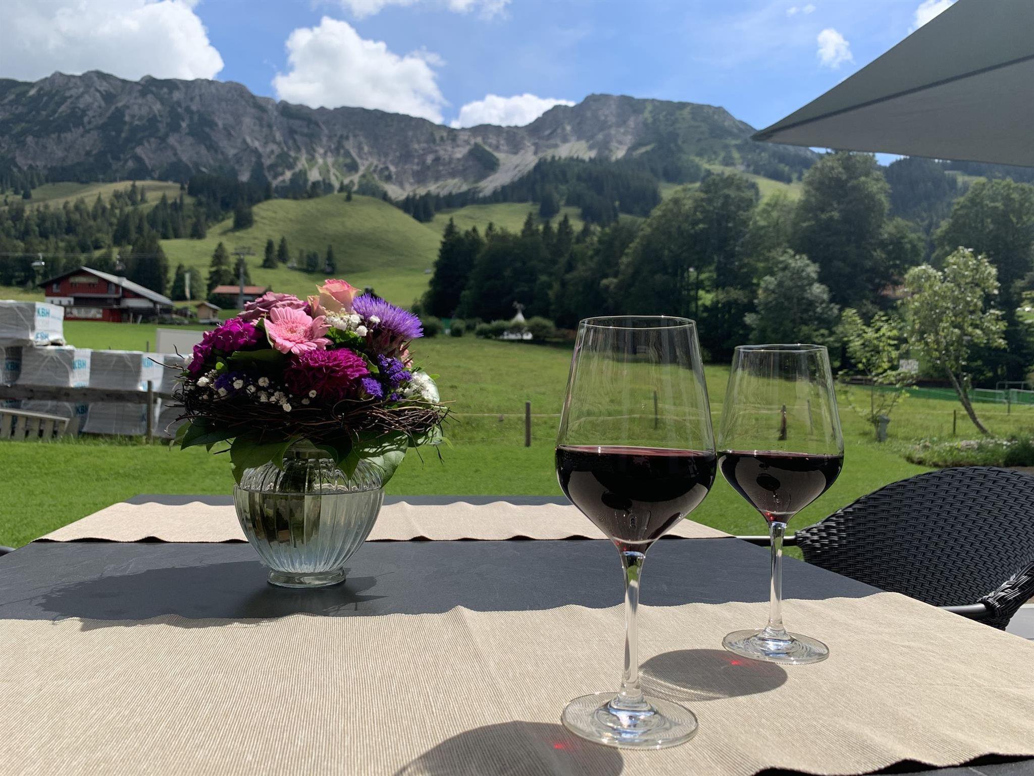 traumhaftes Bergpanorama auf der Süd-Terrasse, Doppelgarage Lademögl. E-Autos, Infos: https://alpenchalet-iseler.de/