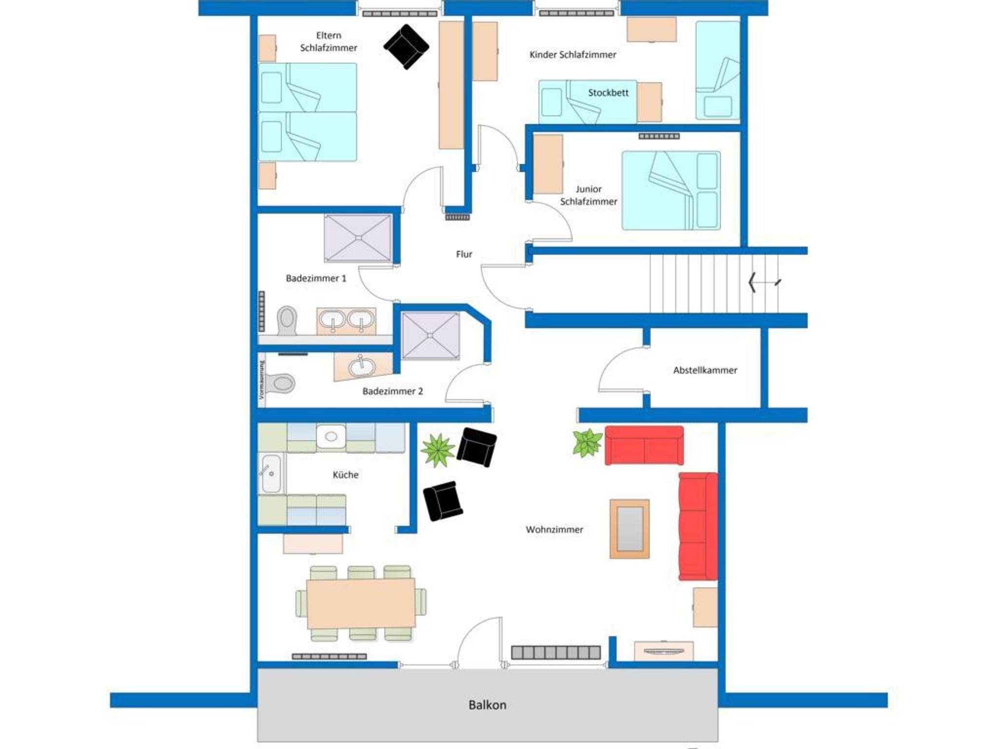Diese Ferienwohnung ist 110 m² groß und verfügt über 3 getrennte Schlafzimmer, die Schlafmöglichkeiten für insgesamt 6 Personen bieten. Zwei Schlafzimmer verfügen über Doppelbetten, Das Kinderzimmer ist mit drei Einzelbetten ausgestattet. Darüber hinaus verfügt die Wohnung über folgende Merkmale: