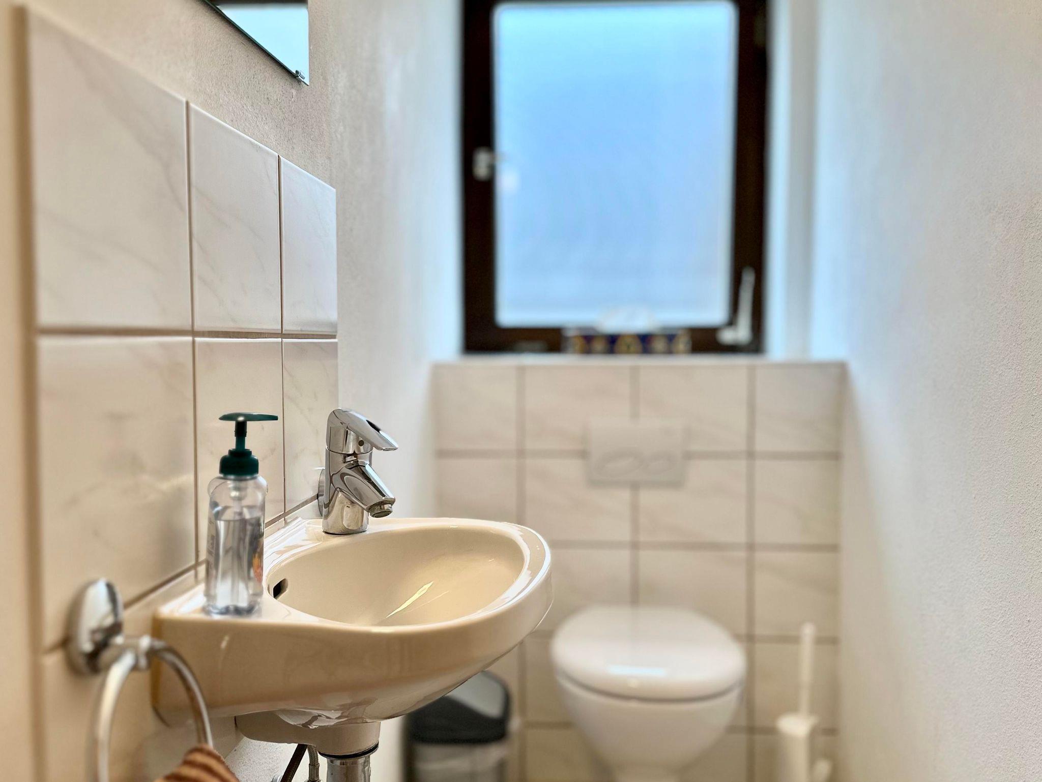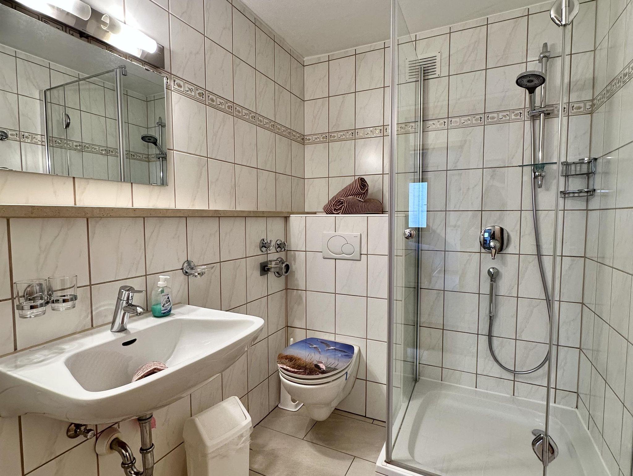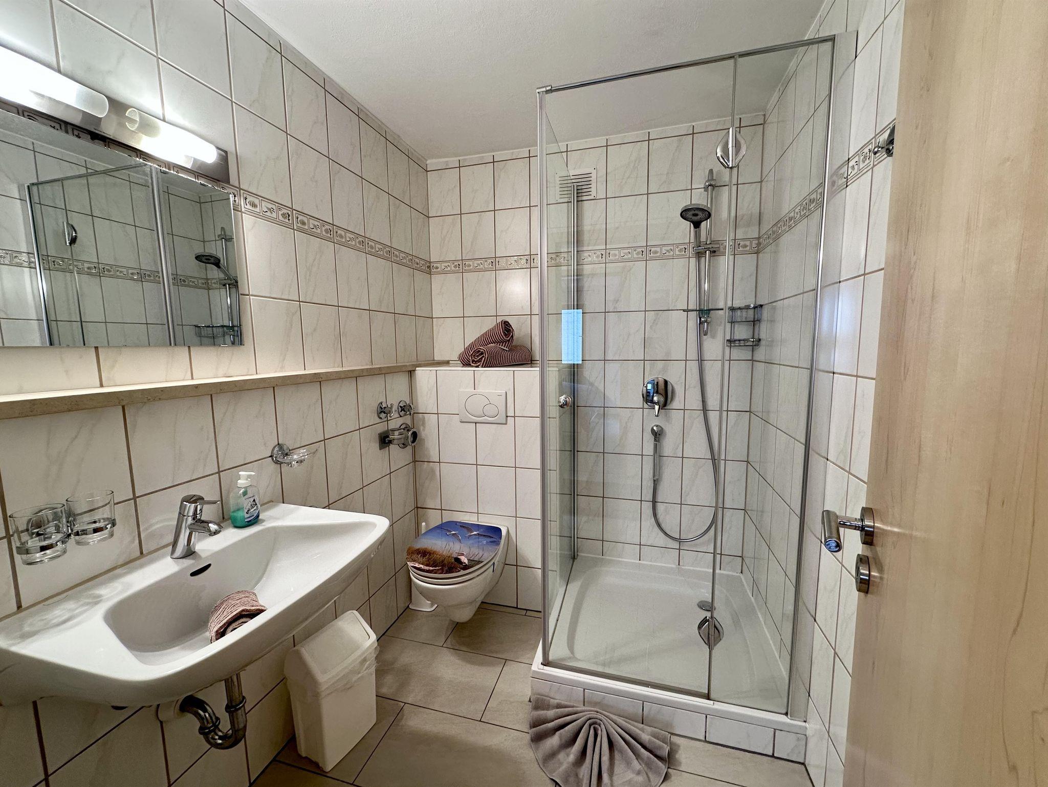 Das Badezimmer verfügt über eine Dusche, ein Waschbecken und eine Toilette. Zusätzlich steht eine getrennte Toilette mit Waschbecken zur Verfügung.