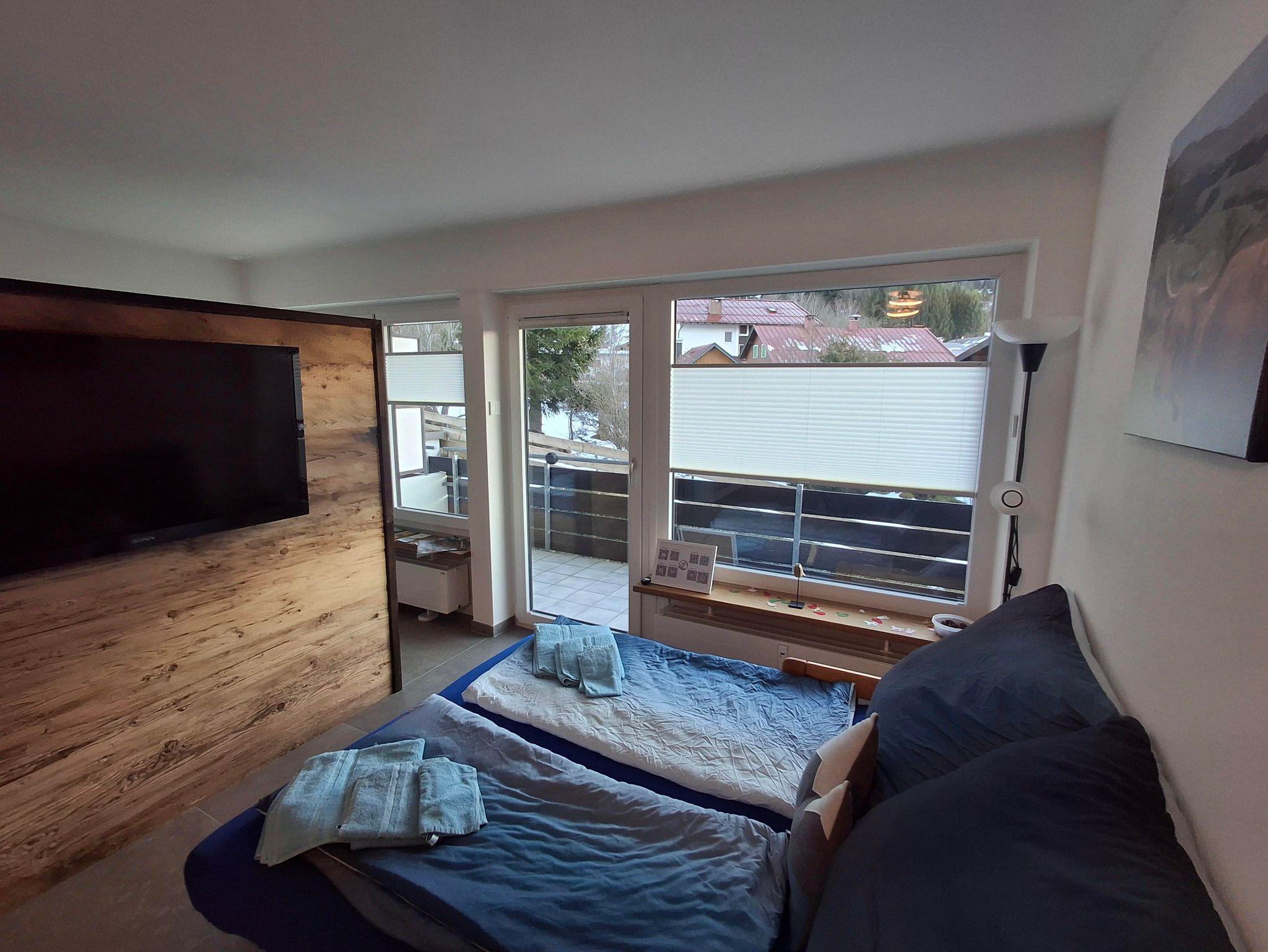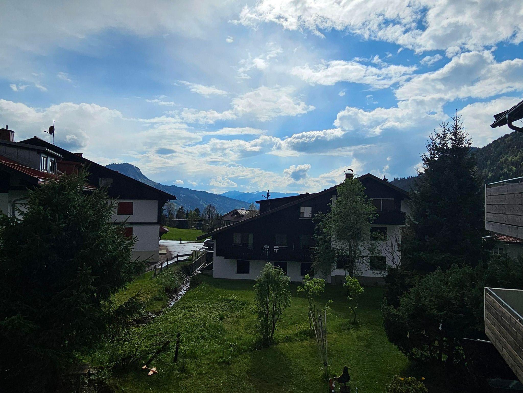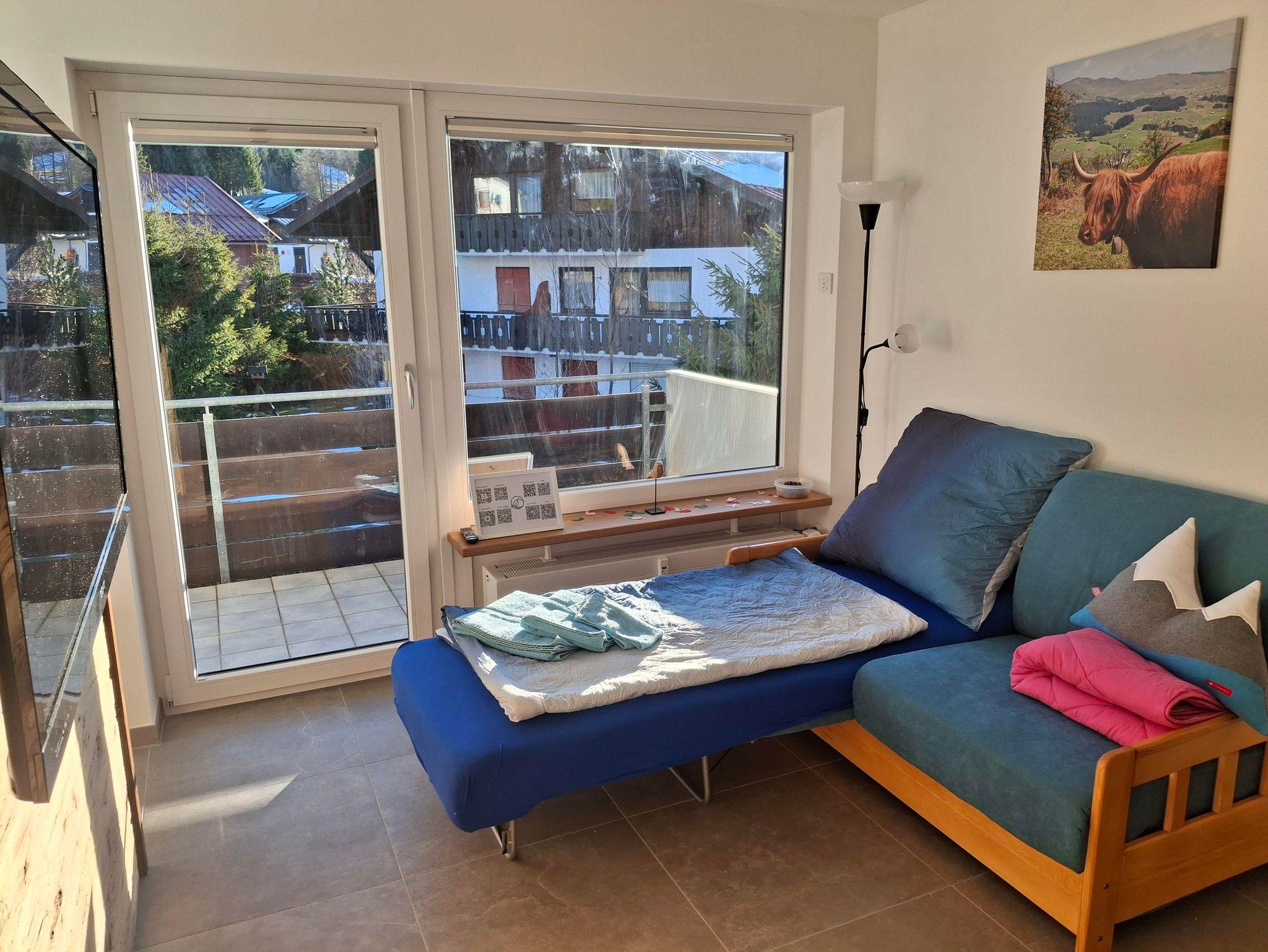 Das moderne Bad mit Dusche und der Südbalkon mit traumhaftem Blick auf den Iseler machen den Aufenthalt besonders. WLAN, TV, kostenloser Parkplatz und Ski-/Schuhkeller sind inklusive.