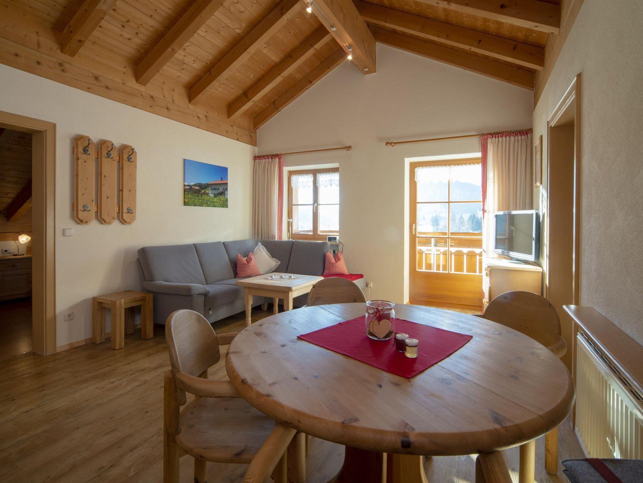 Große komfortable Ferienwohnung mit Sichtdachstuhl,Südbalkon mit herrlichem Blick in die Allgäuer und Tiroler Berge.Gemütlicher Wohnraum mit Couchgarnitur, runder Esstisch, Flachbildschirm , Radio/CD-Player und WLAN.Top ausgestattete Küche mit reichlich Ess.-und Kochgeschirr,Cerankochfeld,Backofen,Kühlschrank,Mikrowelle,Kaffeemaschine,Wasserkocher,Toaster. 2 große seperate Schlafzimmer,schönes Bad mit Dusche/WC und Waschbecken,. Bettwäsche,Dusch.-Hand.- und Küchentücher sind reichlich vorhanden.