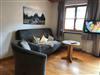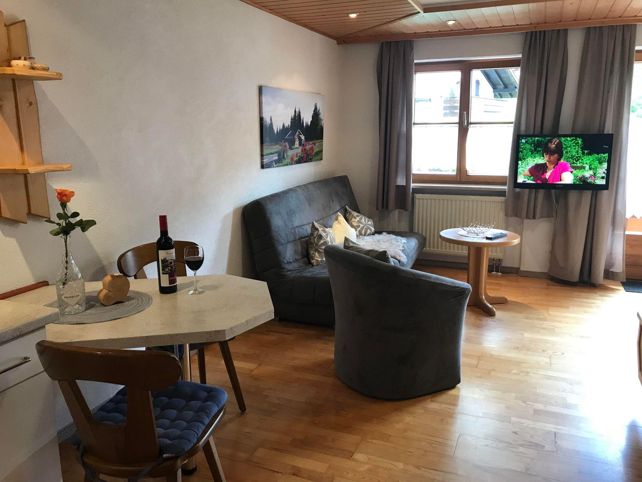 LCD Fernseher , Safe , möblierter Balkon mit Blick zum Hausberg Iseler und Skipiste .