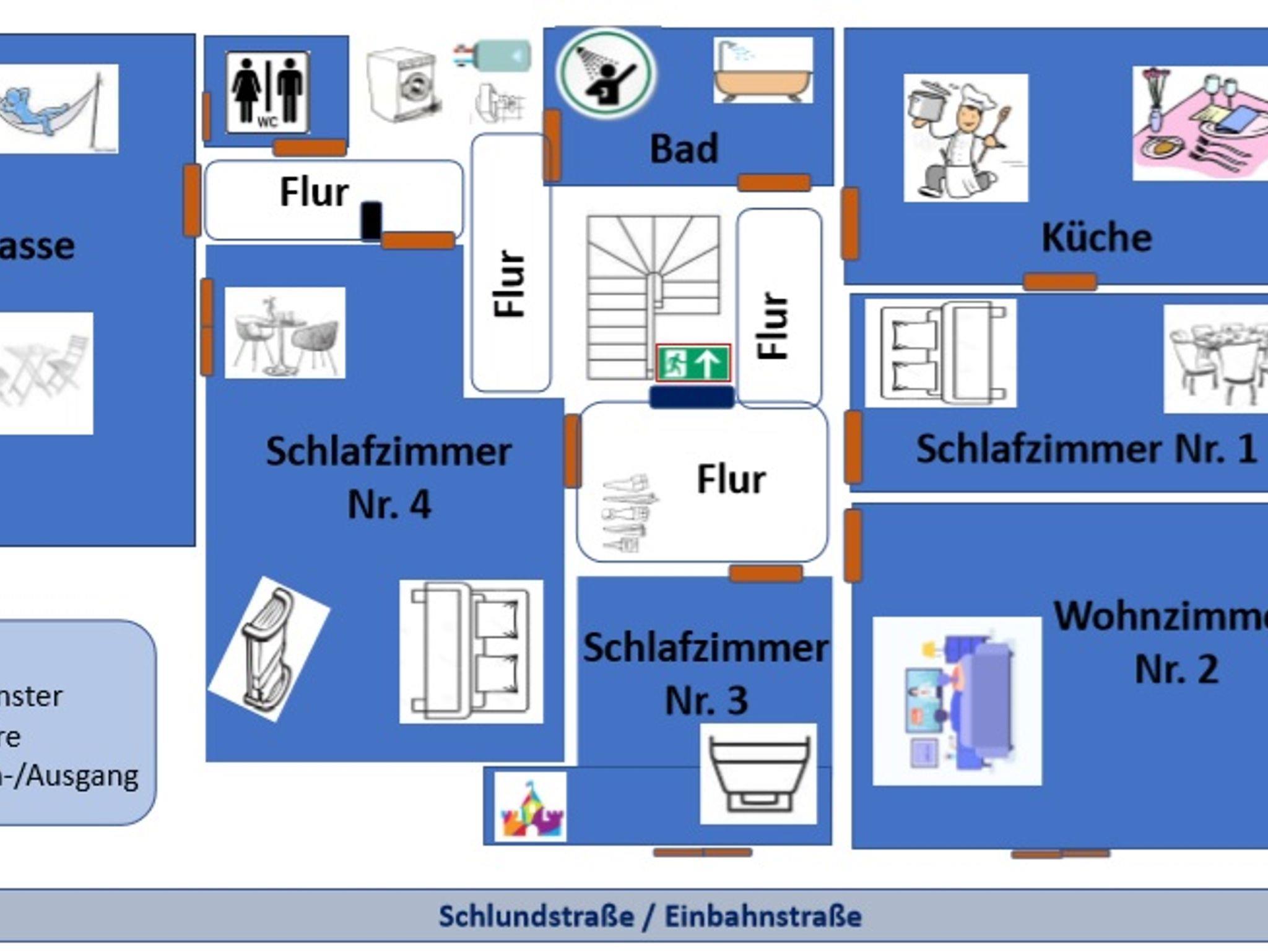 Im gleichen Stockwerk befinden sich direkt daneben 1 weitere Wohnung (kleines 2-Zimmer-Appartment) und 3 weitere Zimmer, die ggf. mit hinzugebucht werden könnten und somit bis zu 22 Personen gemeinschaftlich unterbringen könnten. Hierzu sollten Sie uns jedoch vorher direkt kontaktieren, ob auch alle Zimmer verfügbar sind, da diese auch einzeln vermietet werden.
