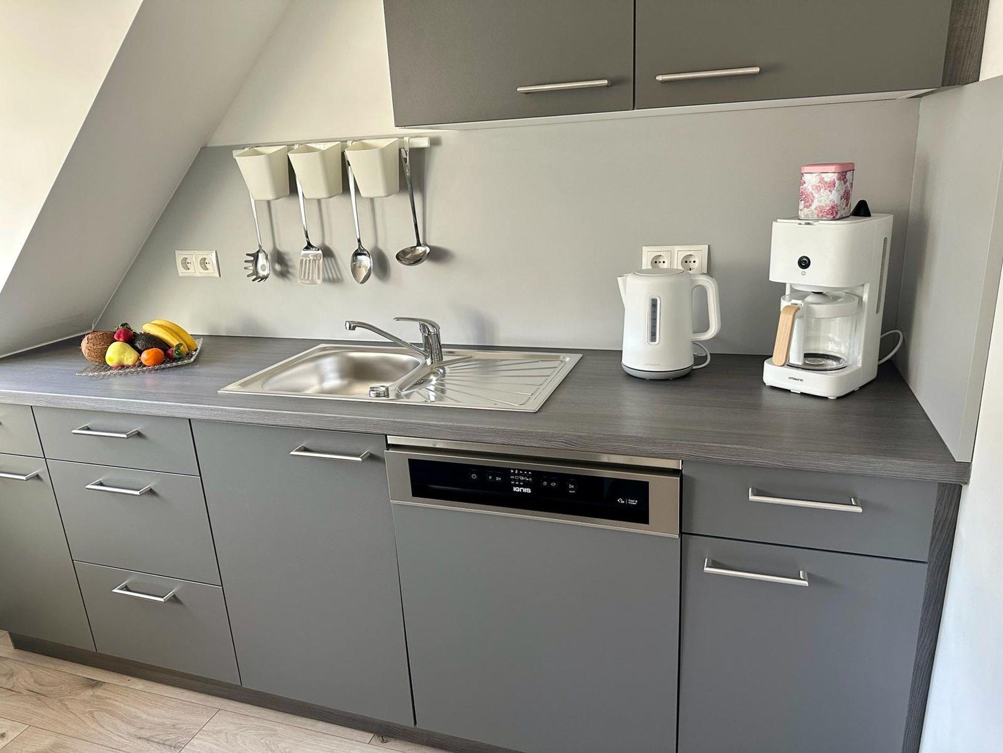 Die Küche ist separat und vollständig ausgestattet mit einer Mikrowelle, einem Kühlschrank, einer Spülmaschine, einem Wasserkocher, einer Kaffeemaschine, sowie Besteck und Kochutensilien. Hier können Sie sich bequem Ihre Lieblingsgerichte zubereiten und gemeinsame Mahlzeiten genießen.