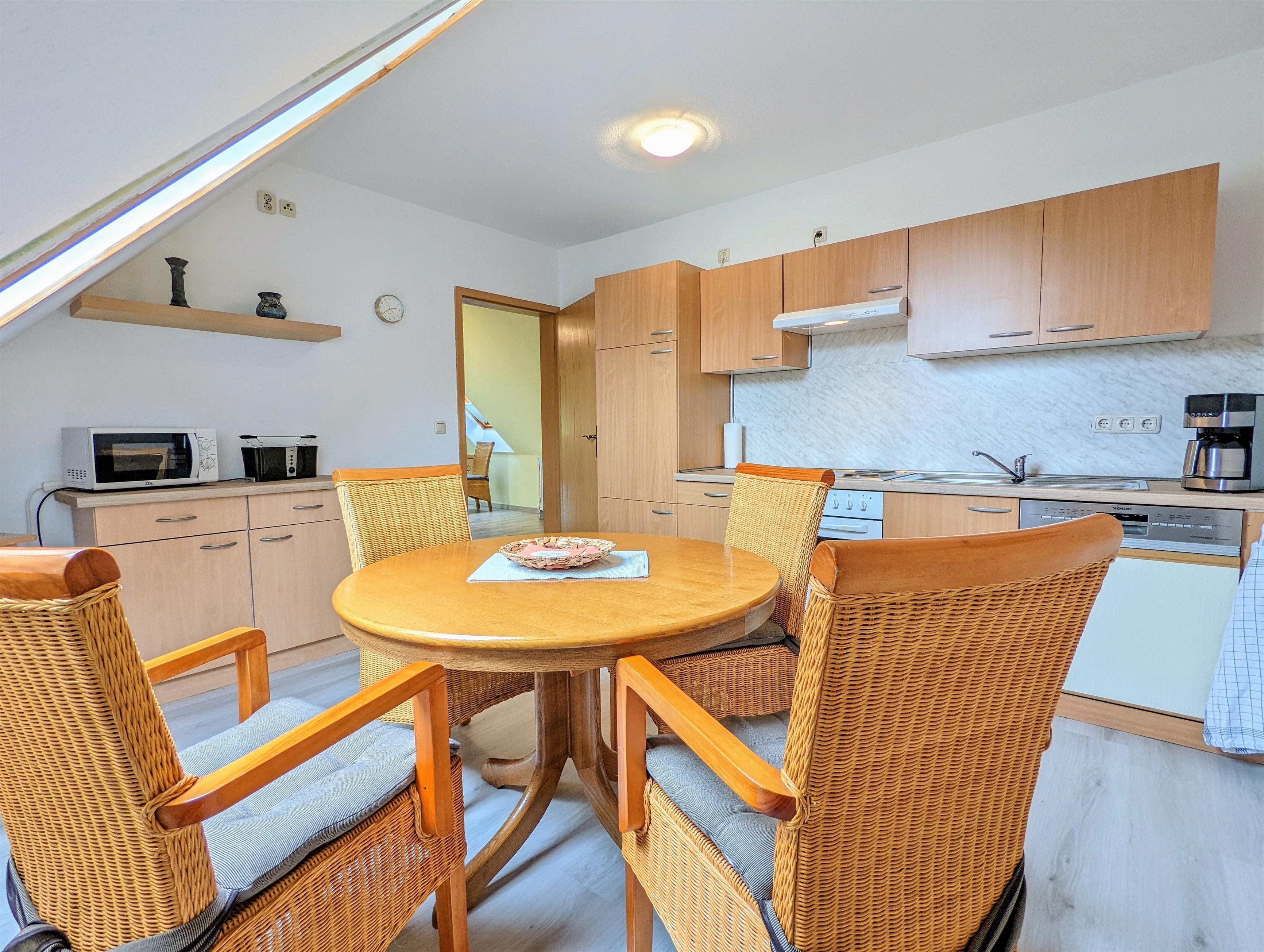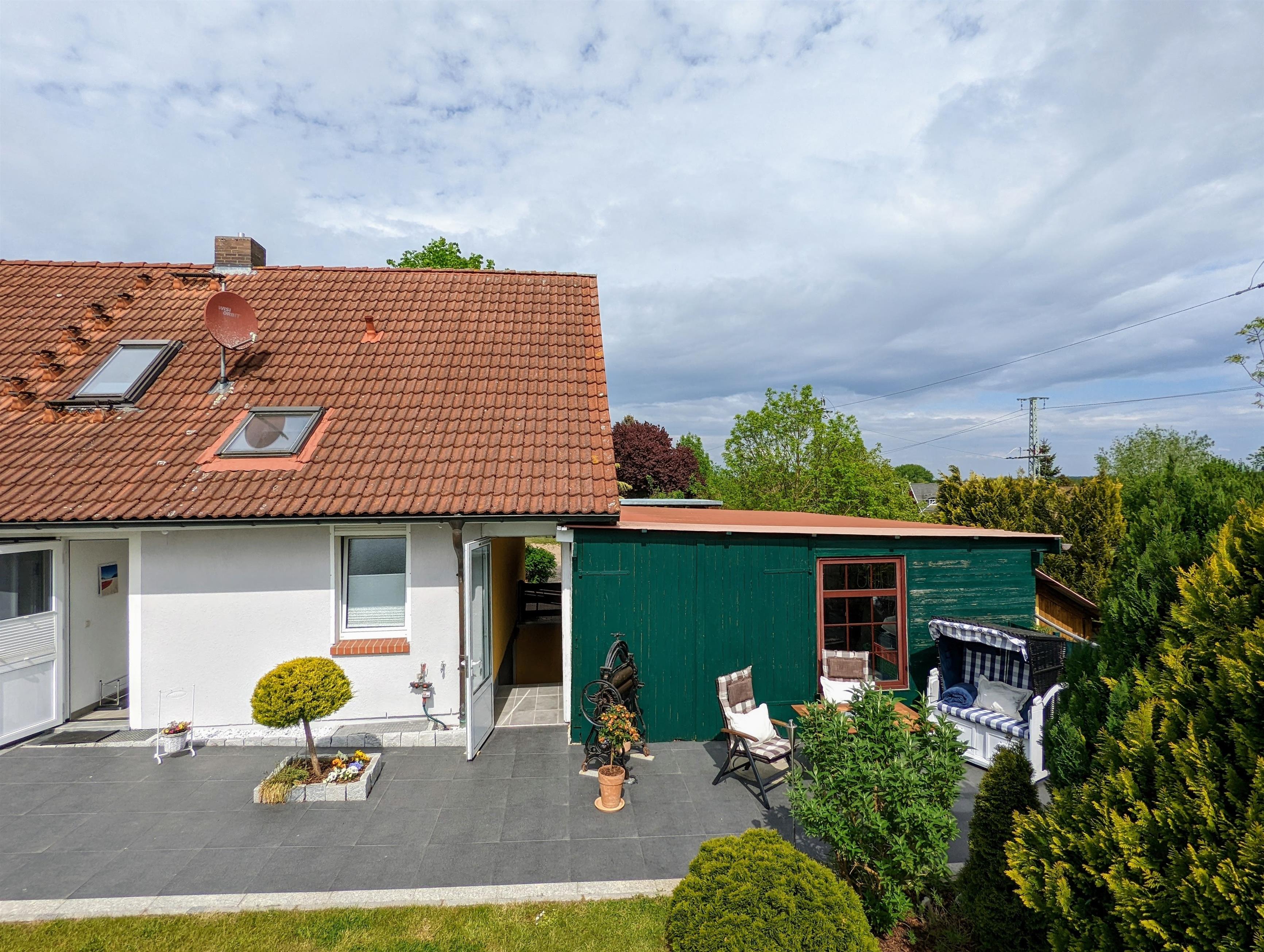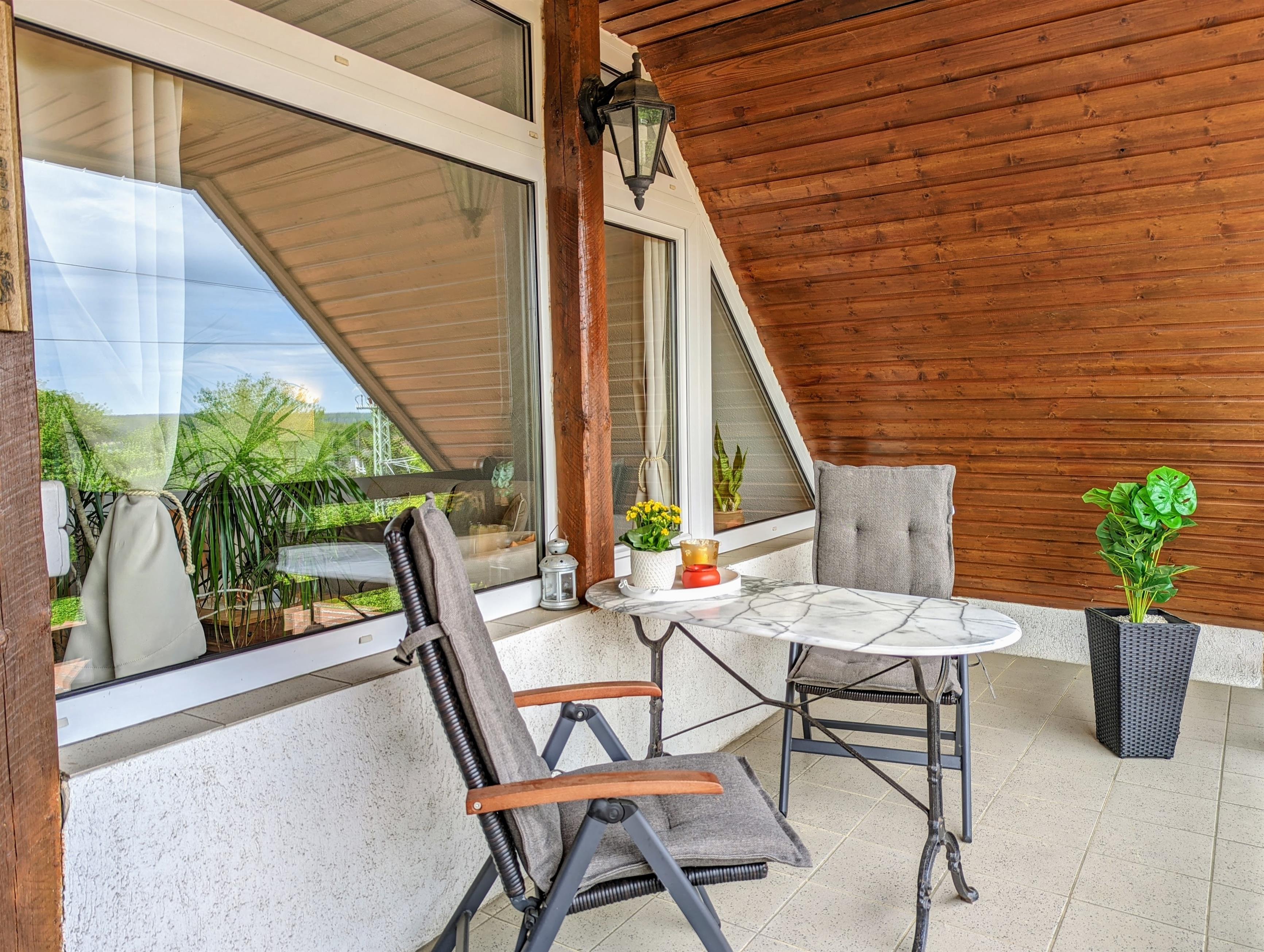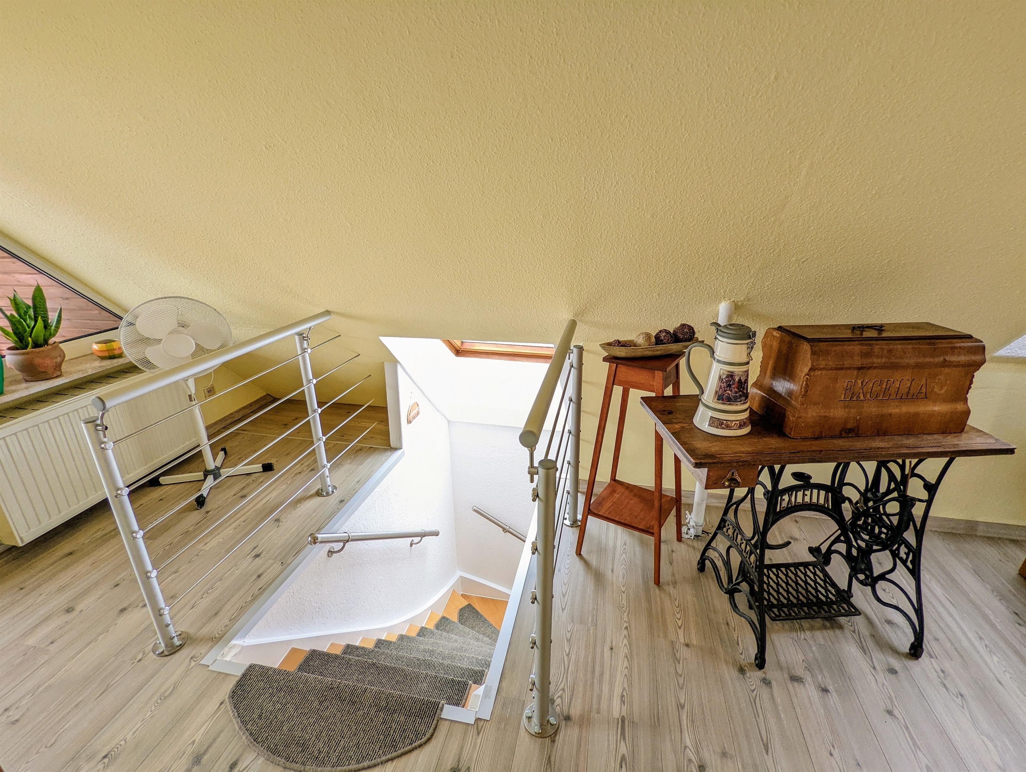 Ein Ort zum Wohlfühlen. Die hochwertig ausgestattete Ferienwohnung bietet ausreichend Platz für 2 Erwachsene + 1 Kleinkind. Auf etwa 55 m² Wohnfläche + Balkon, Freifläche und Wiese können Sie sich wie Zuhause fühlen. Vom Wohnzimmer mit Sat-TV und Schlafsofa (1,40 m breit) und Balkon genießen Sie einen kleinen Seeblick und Blick ins Grüne. Das Schlafzimmer ist mit hochwertigen Matratzen, Kleiderschrank, Insektenschutz und Verdunkelungsmöglichkeit ausgestattet. In der großen und komplett ausgestatteten Küche, mit Essbereich, können Sie leckere Gerichte zubereiten. Das Bad mit Badewanne, Waschbecken und WC besitzt ein Dachfenster, durch das Sie beim Baden den Sternenhimmel sehen können. Die Ferienwohnung befindet sich im 1. Obergeschoss mit separaten Eingang. W-LAN, Carport für Ihr PKW, Strandkorb, Schaukel für die Kinder, Kinderreisebett und Hochstuhl sind vorhanden. Am Grundstück verläuft eine Bahnlinie entlang. Die meisten Gäste stört das jedoch nicht, da der Zug unterhalb des Grundstücks (Hanglage) fährt und nicht sichtbar ist.