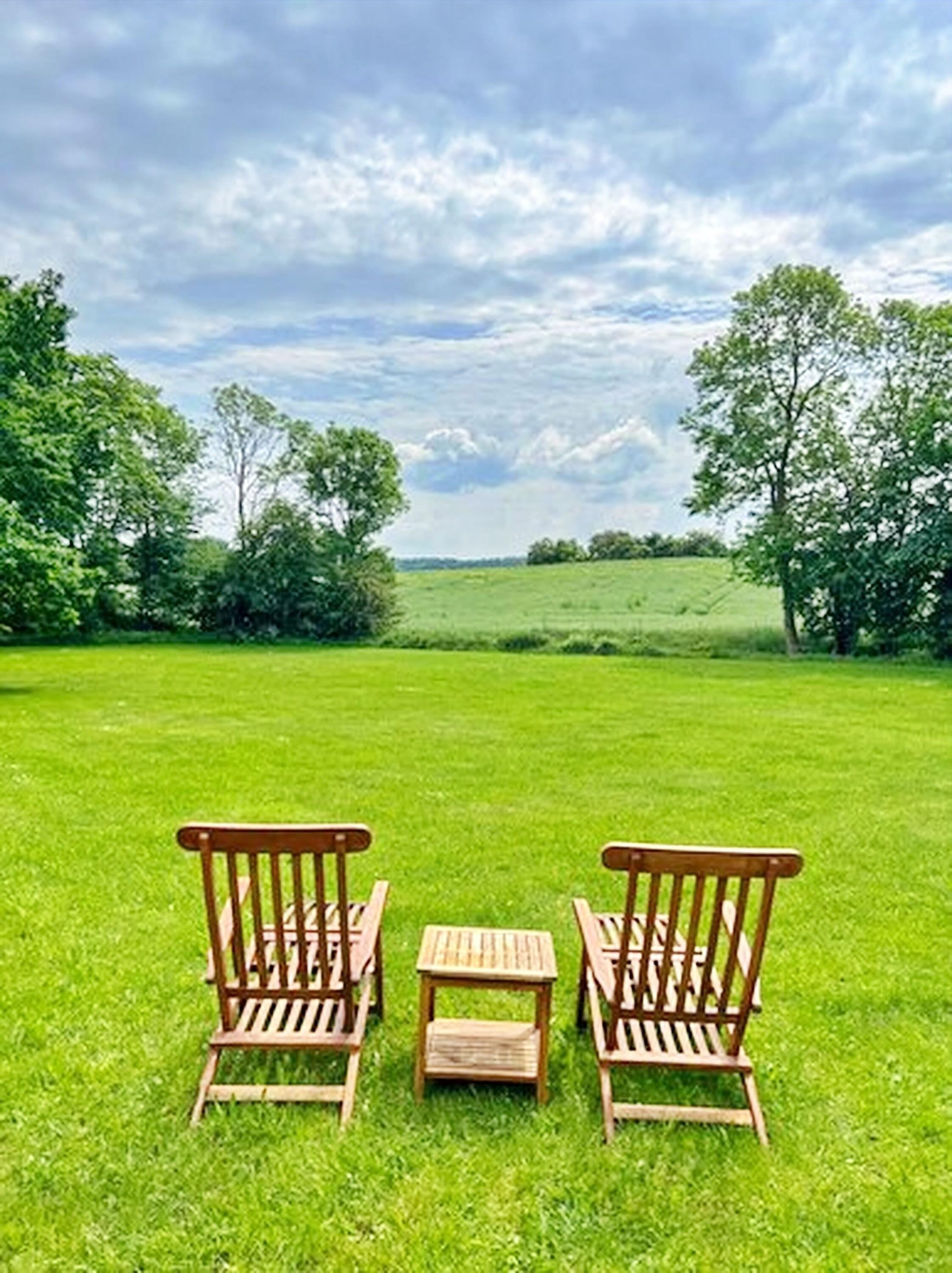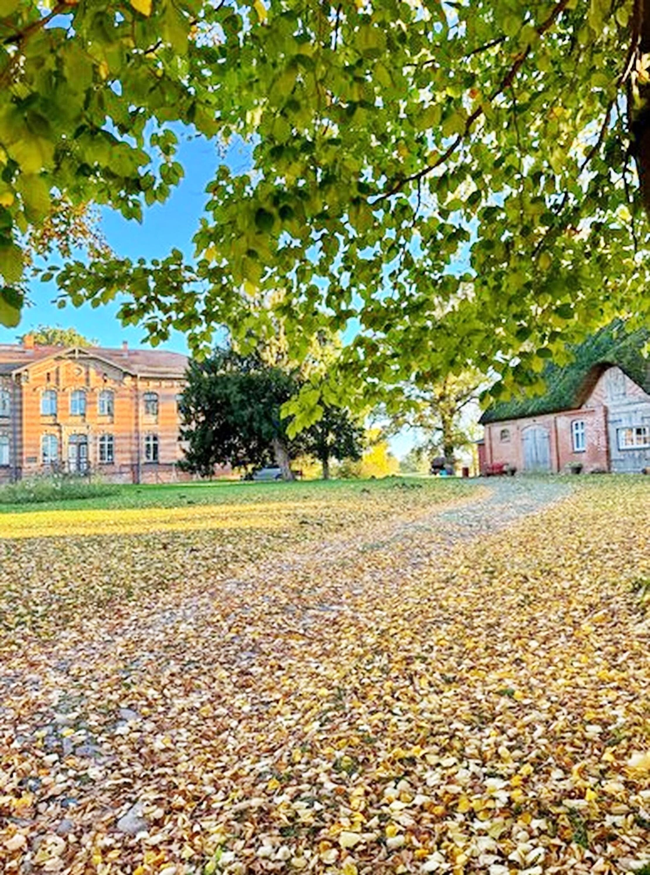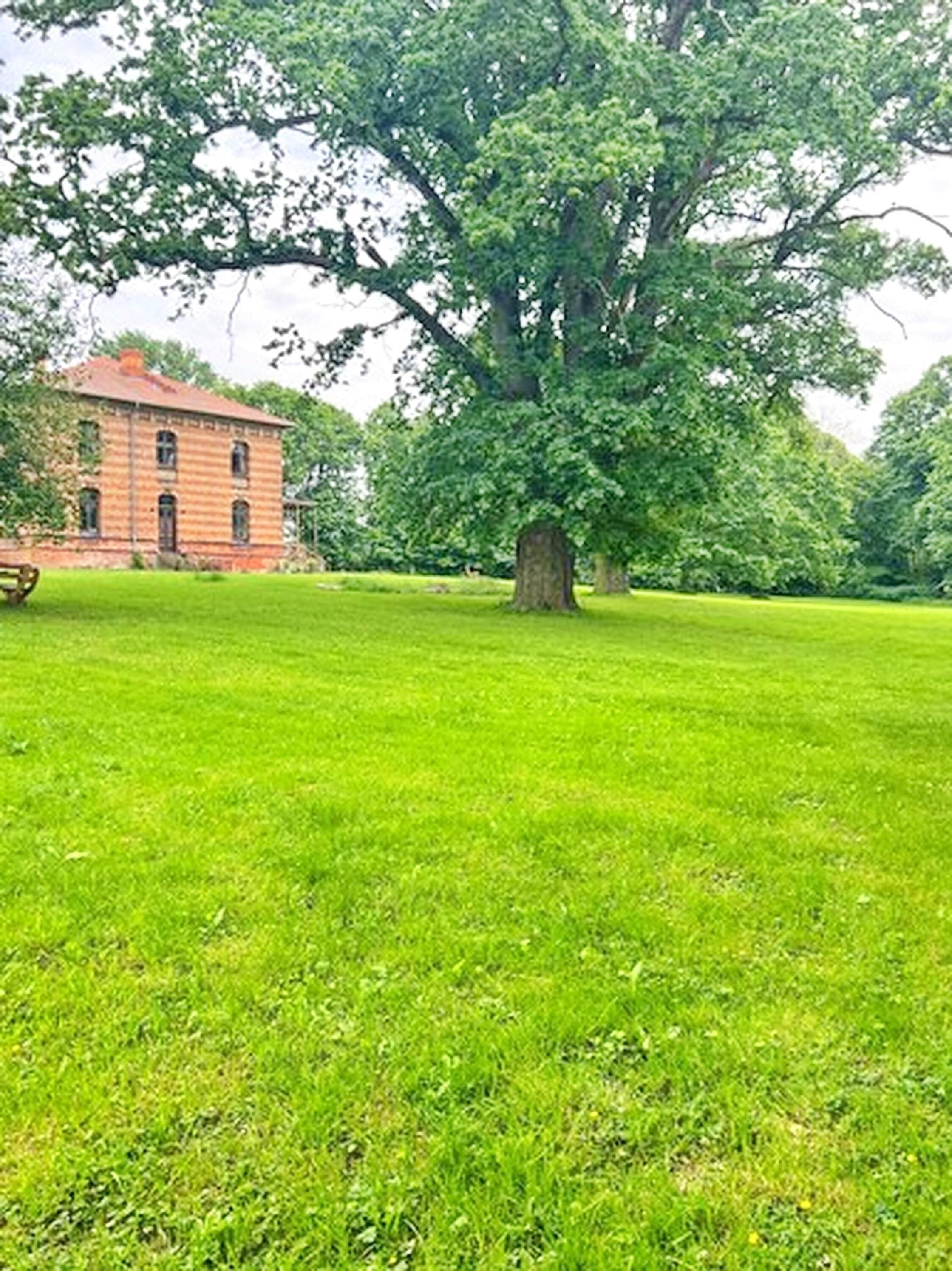 Von der eigenen Terrasse genießen unsere Gäste den herrlichen Blick in den Gutspark.