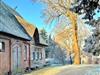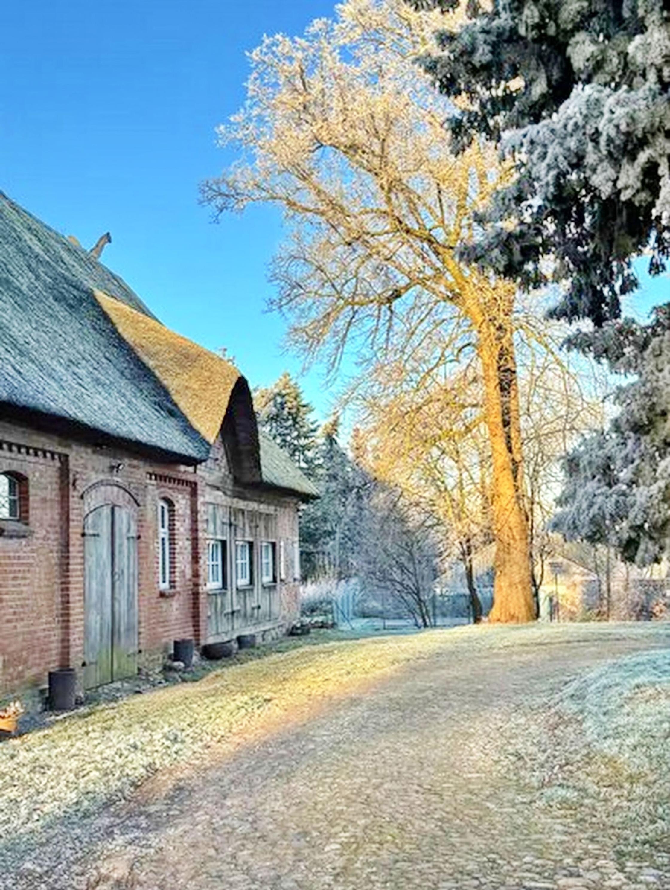 Fährt man die Zuwegung über das Kopfsteinpflaster sieht man das Gutshaus und die dazugehörige reetgedeckte Remise.