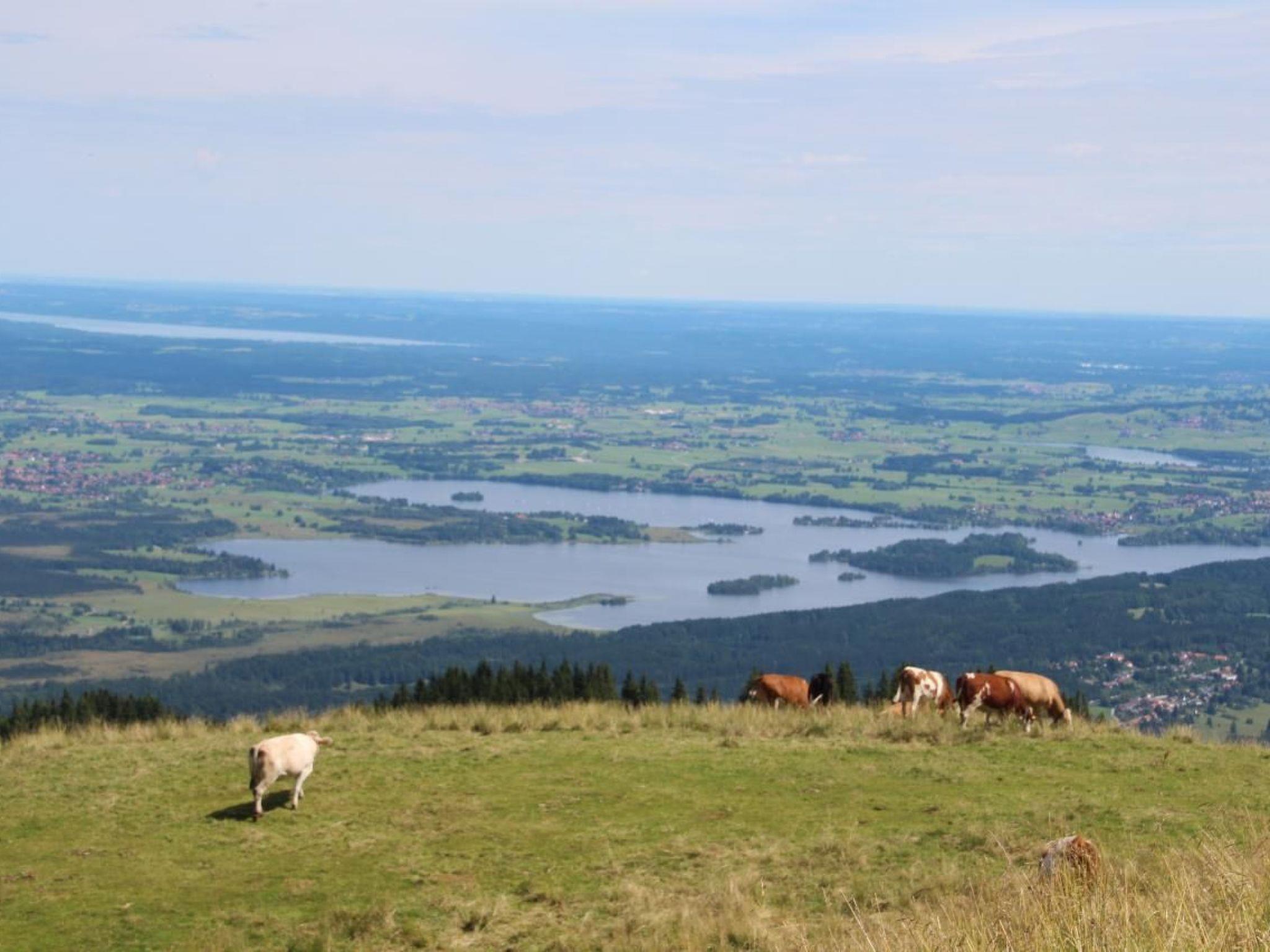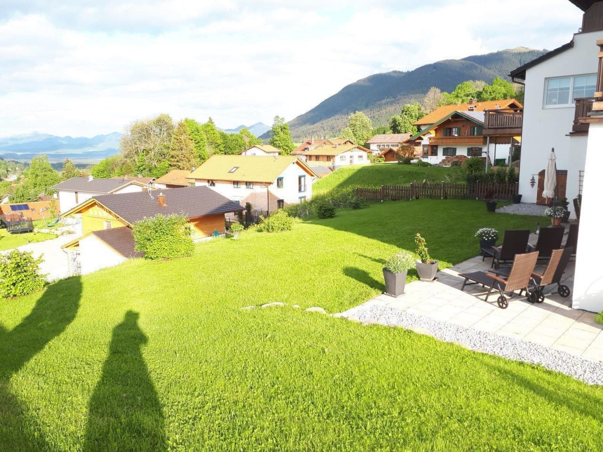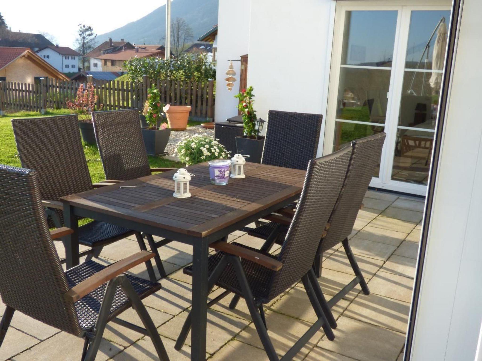 Vom Parkplatz aus, beim Blick auf Ihr Gartentor können Sie schon den phantastischen Ausblick erahnen. Wenn Sie dann durch das Gartentor auf die Abendterrasse gehen und um die Ecke auf die Frühstücksterrasse abbiegen, werden Sie sich über die große Terrasse und den weitläufigen Garten freuen. Aufgrund versetzter Häuser haben Sie eine angenehme Privatspäre auf der Terrasse. Ihre Kinder können unbekümmert im Garten spielen und sie brauchen aufgrund des 1 m hohen Holzzauns zu den Nachbarn keine Angst zu haben, dass Sie in "Nachbarsgarten" laufen. Geradeaus von der Terrasse ist der Blick auf das Ammertal und die Berge nicht durch einen Zaun gestört. Da das benachbarte, geradeaus liegende Grundstück nicht bebaut ist, hat man so einen wunderbaren Blick. Bei sehr kleinen Kindern ist daher eine Aufsicht notwendig.