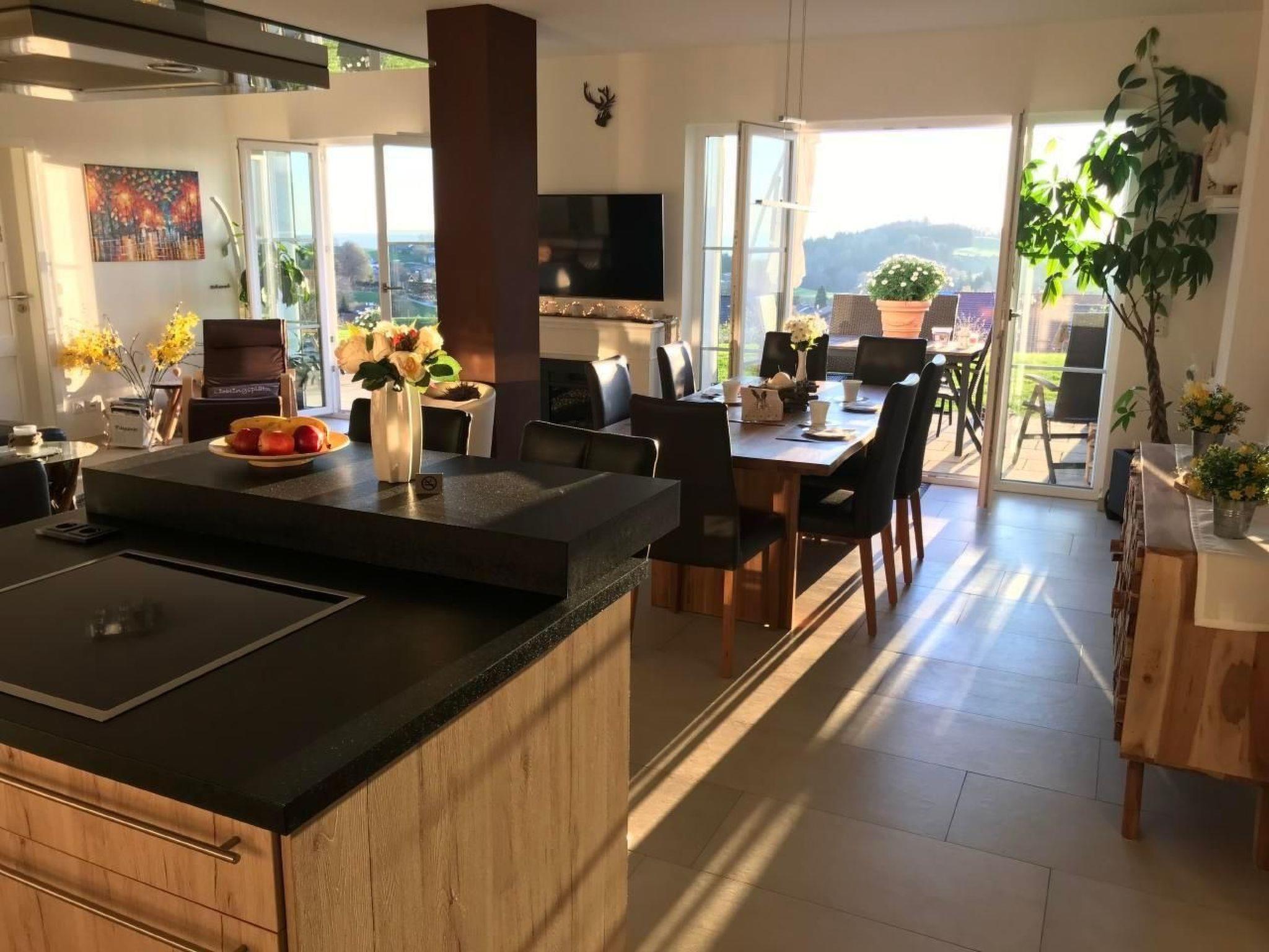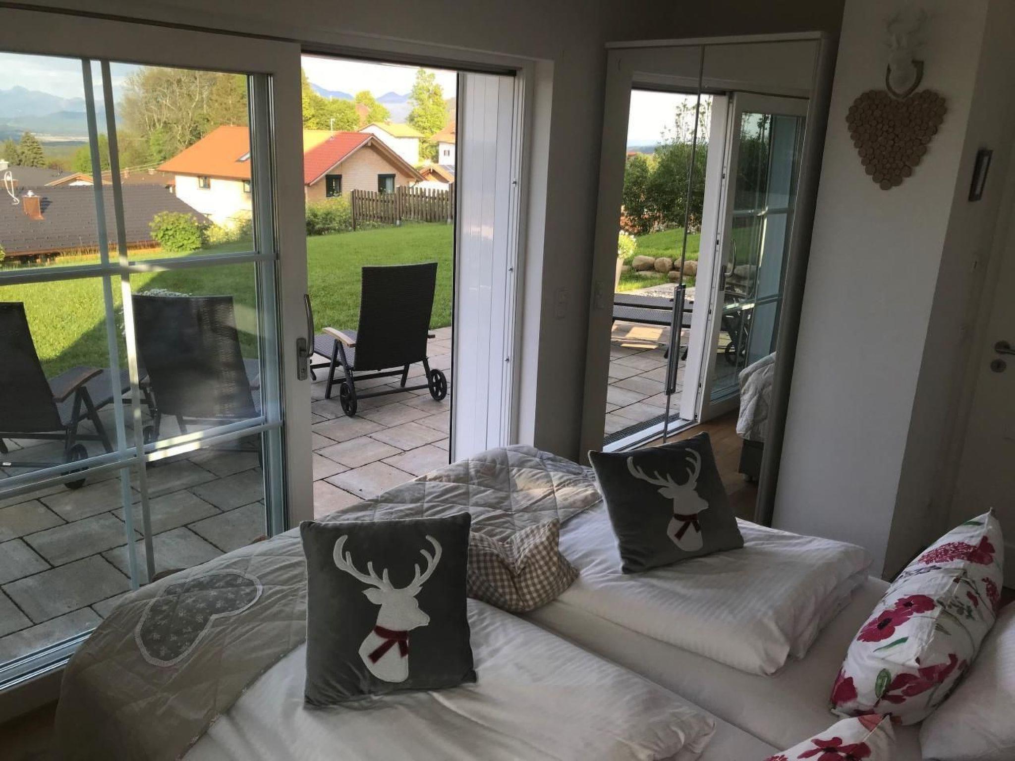 Freuen Sie sich auf die neue, großzügige, mit 5 DTV-Sternen prämierte 126 m² Traum-Wellness-Fewo, 4 Zimmer, mit W-Lan, Infrarotsauna, Elektrokamin, malerischem Ausblick aus 5 Terrassenausgängen zur rd. 50 m² großer Terrasse mit modernen Terrassenmöbeln und Sonnenliegen auf der Sie in der Morgensonne bei einem stärkenden Frühstück einen erholsamen Urlaubstag beginnen können. Genießen Sie den herrlichen Ausblick der exklusiven Fewo Alpenblick Hörnle!