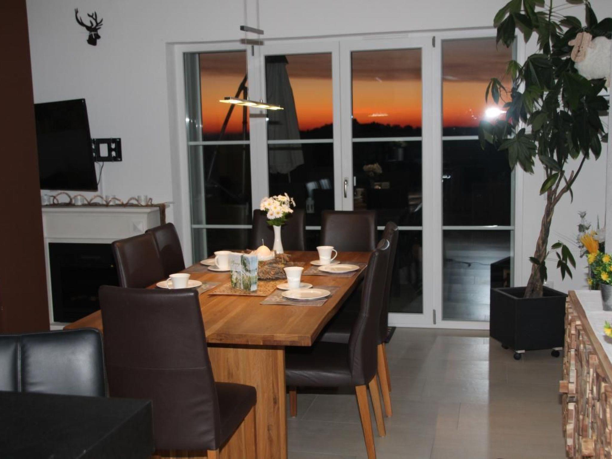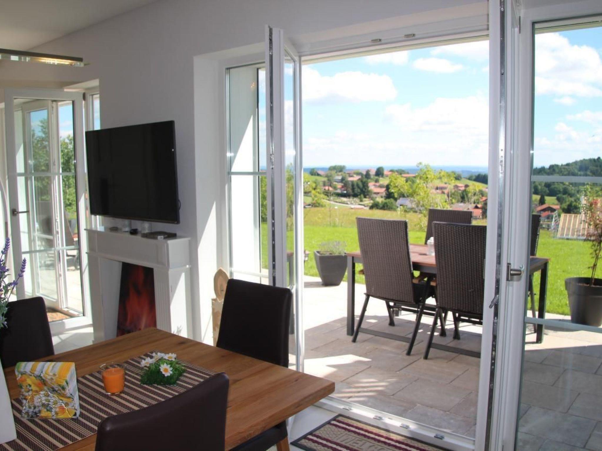 Treten Sie ein in den einladenden, knapp 50 m² großen, hellen, uneinsehbaren Wohn-Essbereich mit viel Wohlfühlatmosphäre, 49 Zoll Smart-TV, Leseecke, Elektrokamin, gemütlichem neuem Lederecksofa mit Blick auf das Ammertal und das bayrische Voralpenmassiv, hochwertiger Leder-/Massivholz Essgruppe mit phantastischem Ausblick beim Frühstück auf den Sonnenaufgang über den Bergen.
