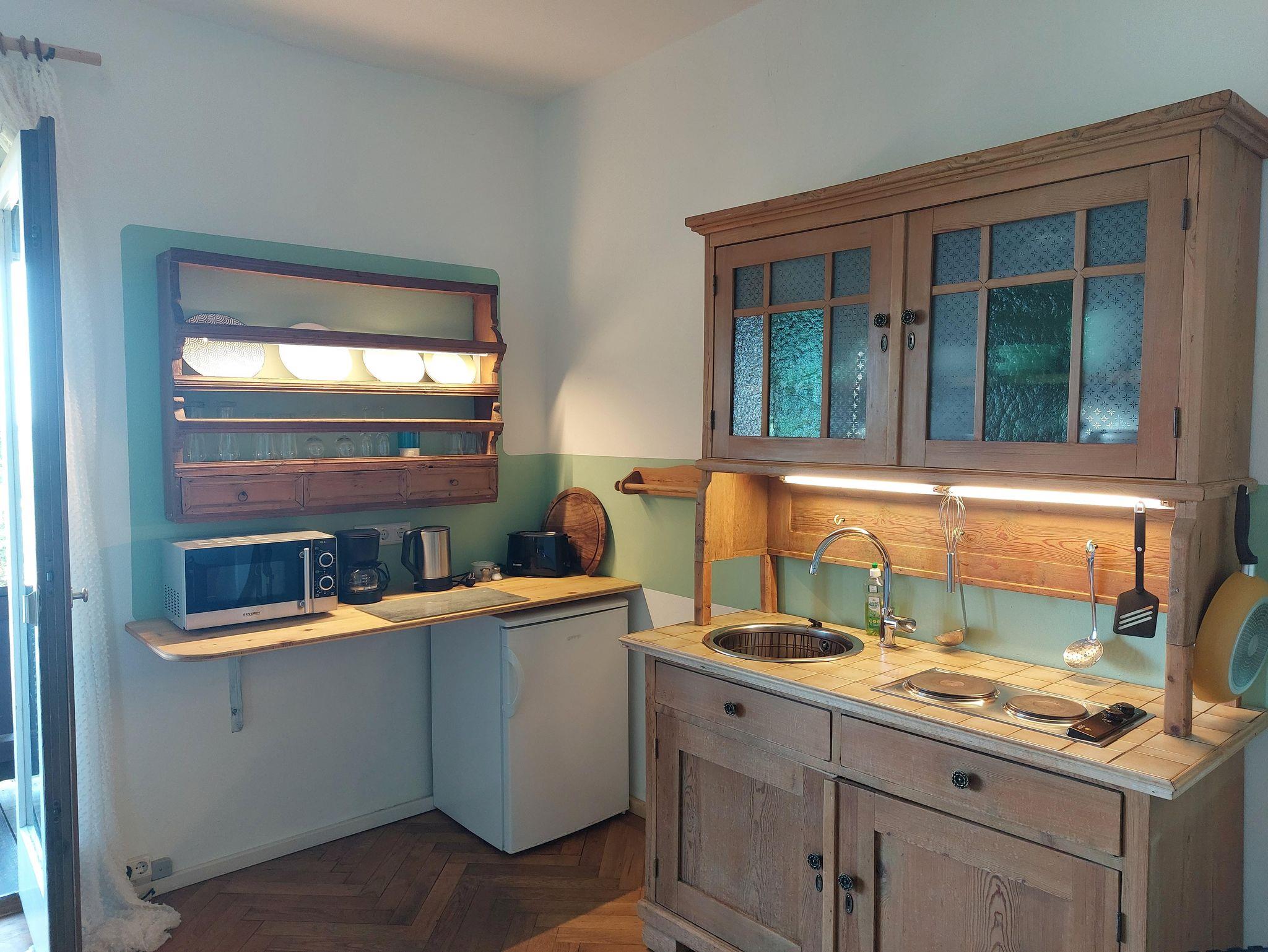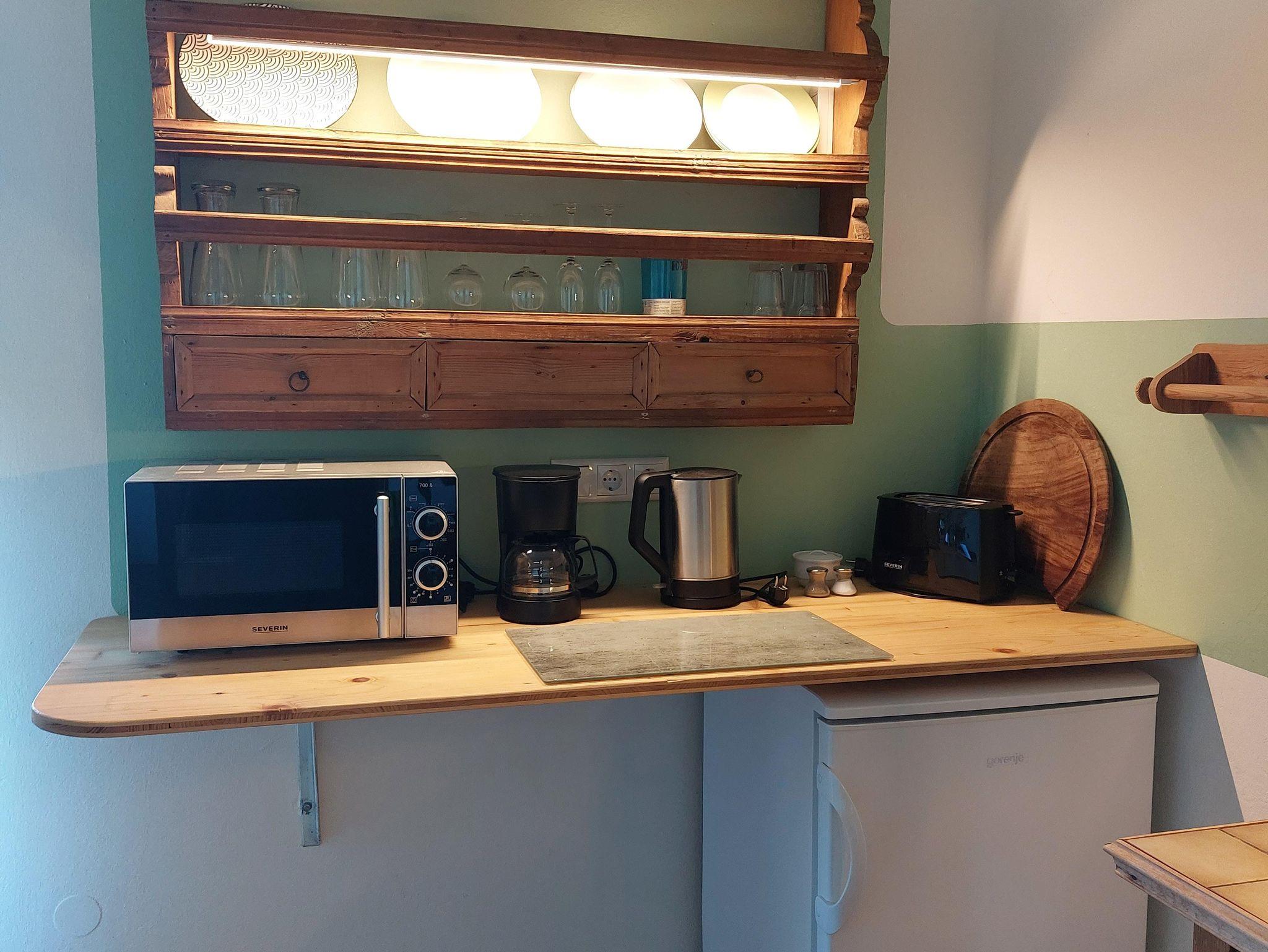 Die Ferienwohnung ist ein Einzimmerappartement mit Küche, Bad und einem Balkon. Die Einrichtung ist einfach und funktionstüchtig. Die Gäste können die Räumlichkeiten im Erdgeschoss (Gastraum und Weinstube) mit nutzen. Das W-LAN im gesamten Haus ist abschaltbar.
