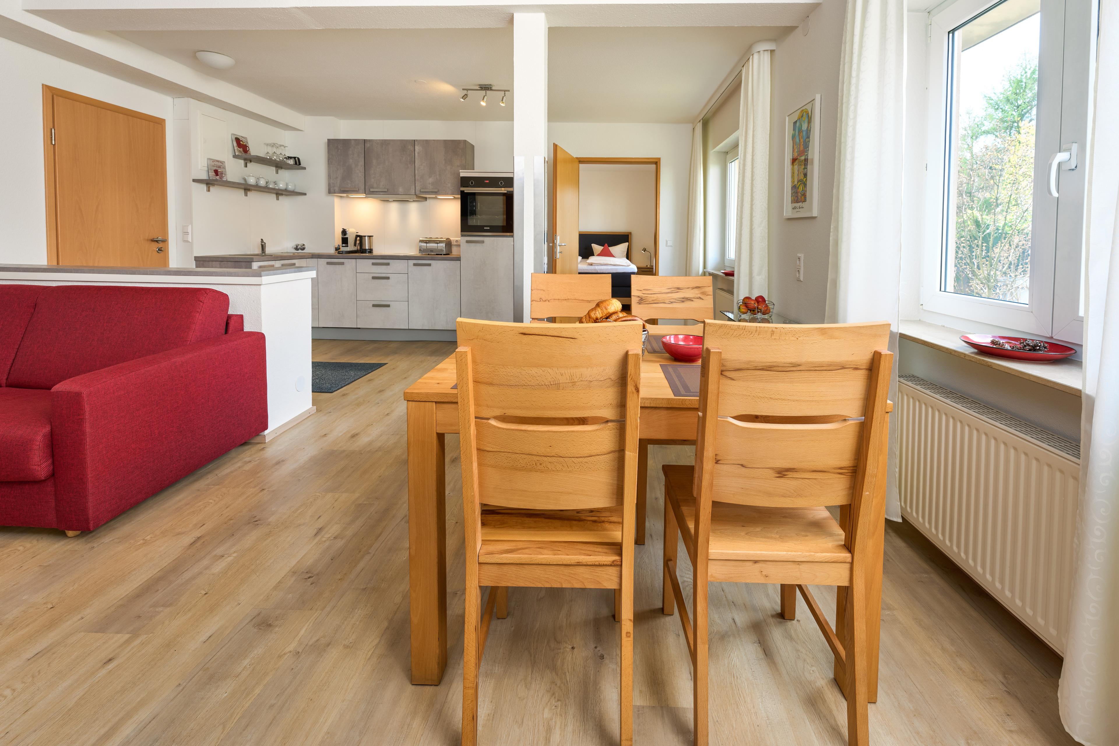 Das Appartement ist ein Hochparterre Appartement mit einem Balkon, welcher Richtung Westen ausgerichtet ist. Das Appartement ist ohne Stufen zu erreichen. Das Schlafzimmer ist vom Wohnzimmer mit einer Tür abgetrennt. Es ist ein 2 Raum Appartement. Die Küche ist im Wohnzimmer integriert. Im Wohnzimmer gibt es auch eine Essecke, komfortables Sofa zum Schlafen, um zu entspannen oder das TV zu schauen.