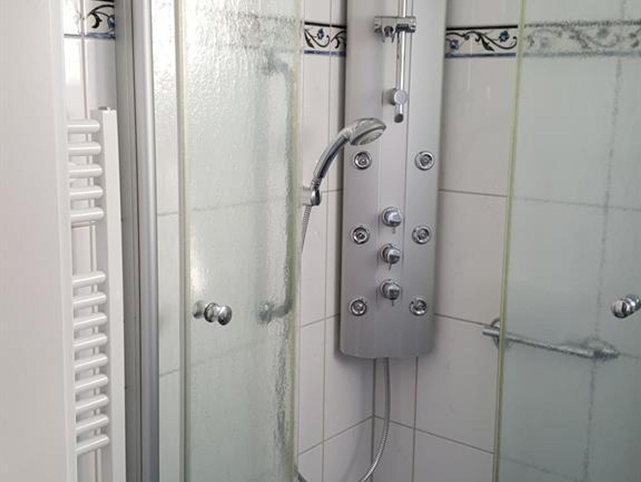 Badezimmer: Duschkabine mit Massagedusche, WC, Waschbecken, großer Spiegel, Handtuchheizkörper. Handtücher, Toilettenpapier & Hygieneartikel inklusive.