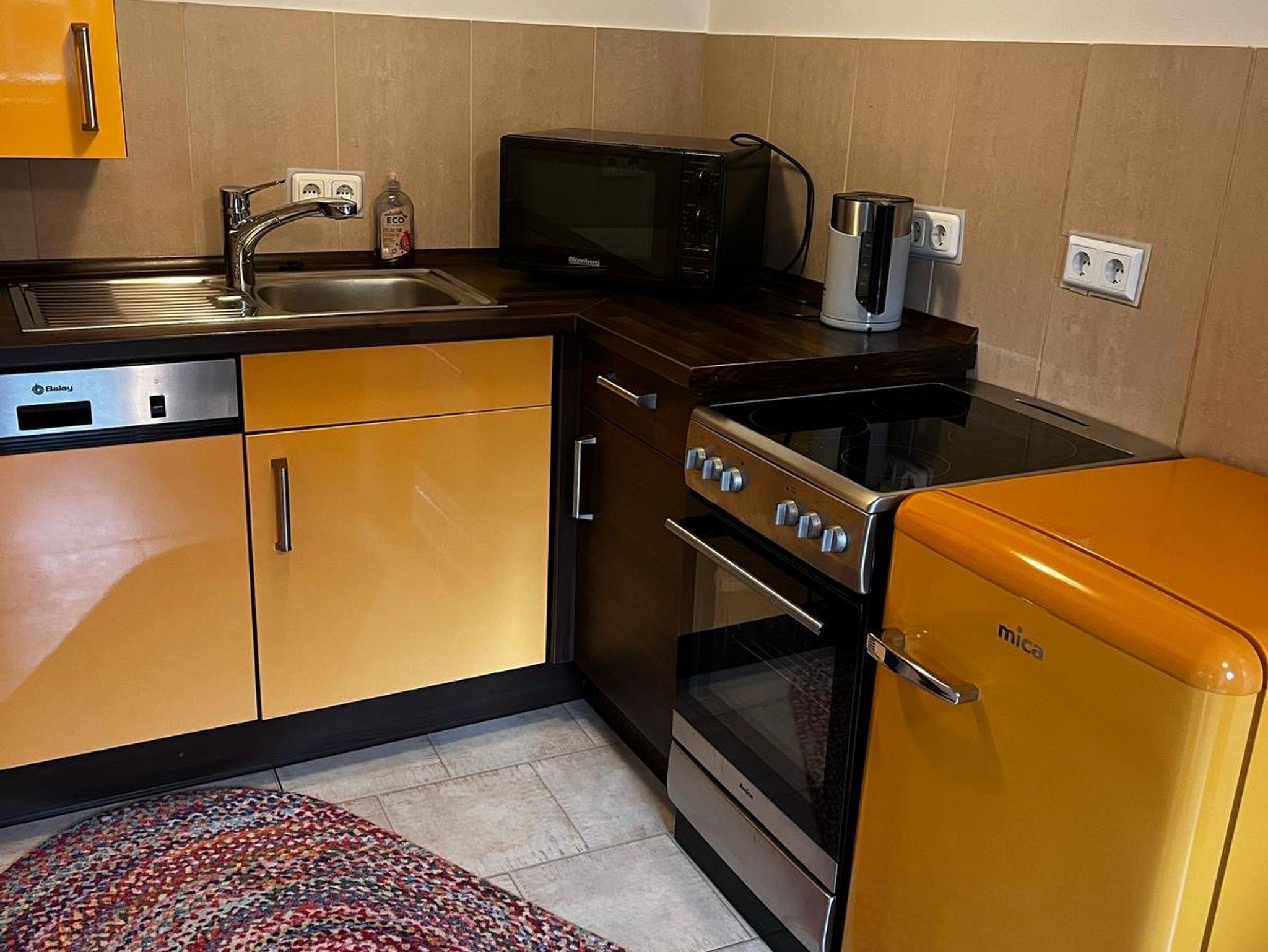 In der Küche gibt es einen Geschirrspüler, eine Mikrowelle, einen Backofen mit Herdplatten, einen Toaster, einen Eierkocher, einen Kühlschrank sowie eine Filterkaffeemaschine und einen Wasserkocher. Die Wohnung ist teilweise mit Laminat- und teilweise mit Fliesenboden ausgelegt. Im neu renovierten, geschmackvollen Badezimmer befindet sich eine grosse Dusche, ein WC sowie ein Waschbecken.