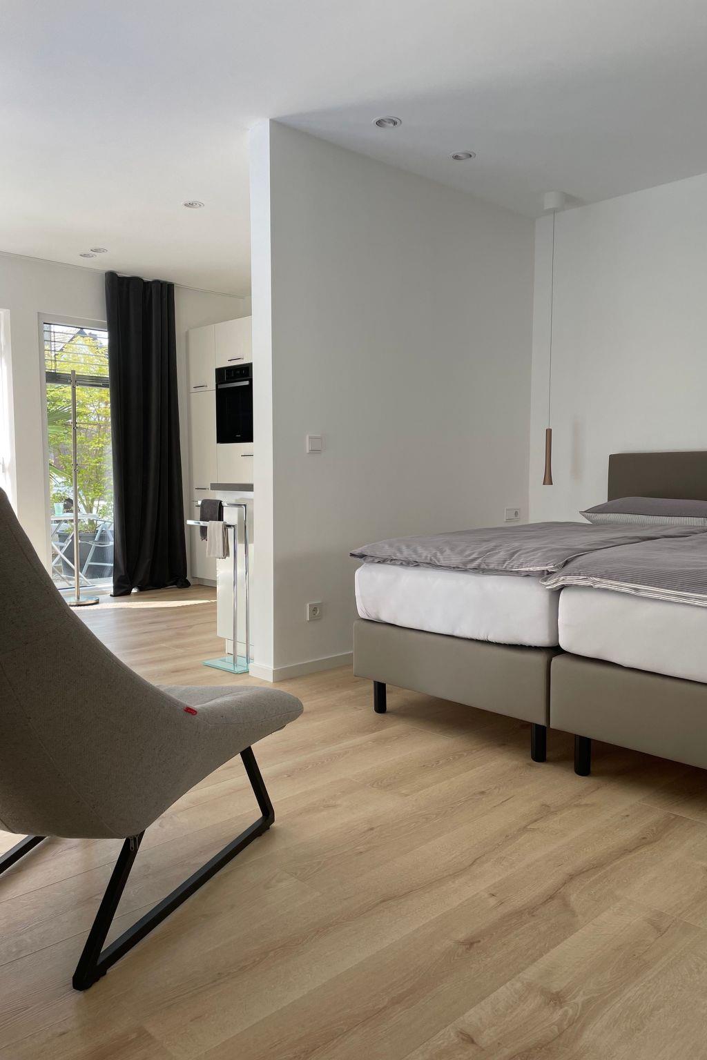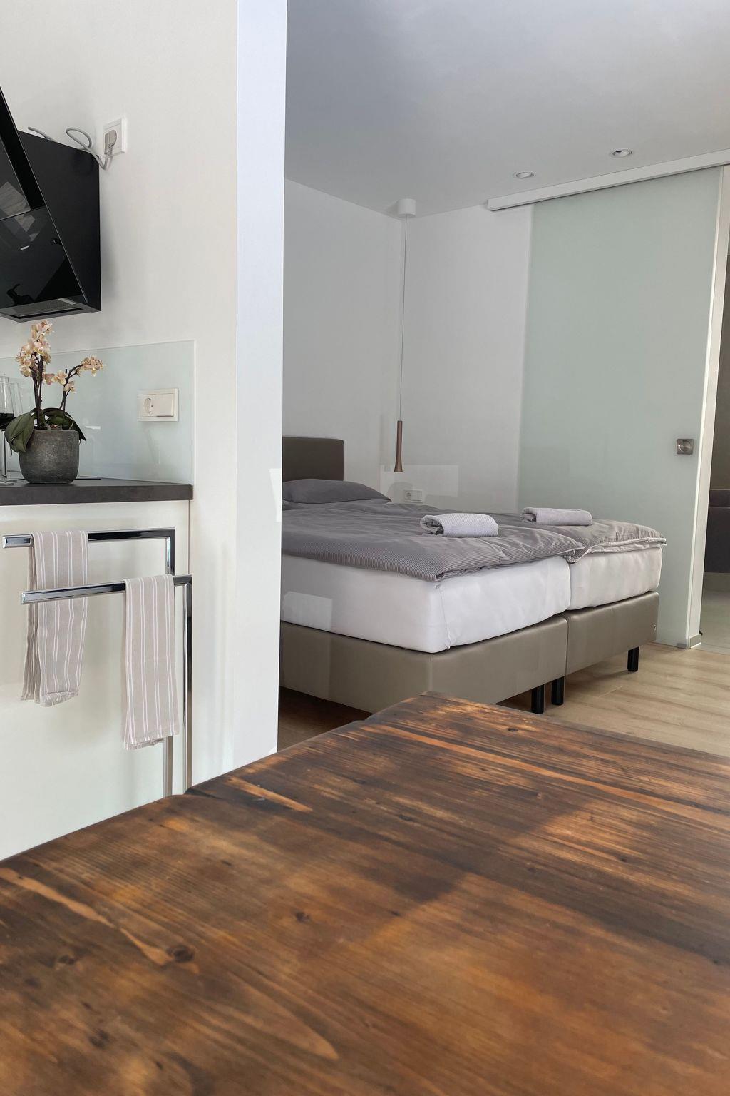 Ebenerdig zugängiger Flachbau mit 48 qm Wohnfläche. Fertigstellung 2023. Bodentiefe Fenster bieten viel Helligkeit und können mit elektrischen Raffrollos abgedunkelt werden. Laminatfußboden (Allergikerfreundlich) mit Fußbodenheizung, TV (43 Zoll); Wandschrank mit Safe, Küche mit Geschirrspüler, Kühlschrank inklusive Gefrierfach, Umluftabzugshaube, Kaffeevollautomat, Toaster und Wasserkocher. Genüssliches Schlafen im gemütlichen Boxspringdoppelbett. Bei Bedarf steht eine ausziehbare Couch zur Verfügung. Komplette Ausstattung des Bades mit barrierefrei zugänglicher Regendusche, WC, Waschtisch und Föhn. Gegen Aufpreis besteht in der Wohnung die Möglichkeit zur Nutzung einer Waschmaschine nebst Wäschetrockner. Bettwäsche und Handtücher im Preis inklusive.