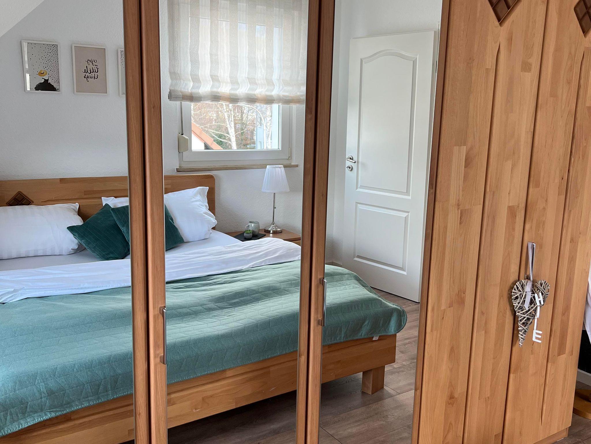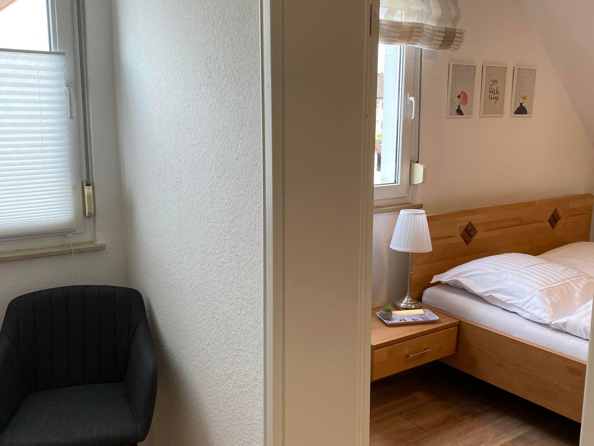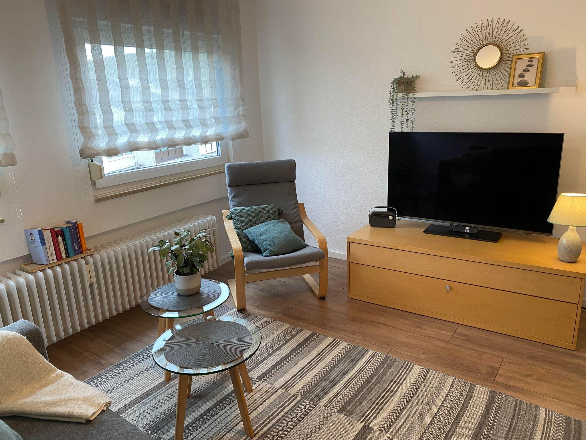 Im Wohnzimmer kann man nach einem langen Tag wunderbar den Tag ausklingen lassen und auf der komfortablen Schlafcouch oder dem dazugehörigen Sessel die Beine baumeln lassen, um gemeinsam die Eindrücke des Tages Revue passieren lassen . Ein Smart TV steht für Ihre eigene Zugänge bereit. Die ausziehbare Schlafcouch bietet darüber hinaus ein bequemes zweites Nachlager für weitere 1-2 Personen. Die Couch ist 1,40m x 2 m und hat eine durchgängige Matraze. Dadurch kann ein seperates Wohn-Schlafzimmer entstehen. Zum Streamen steht kostenlos ein Wlan zur Verfügung. Gerne können Sie auf Nachfrage ein zusätzliches, separates Zimmer buchen, wenn Sie lieber ein weiteres Schlafzimmer möchten statt der Schlafmöglicherkeit auf der Couch. Fragen Sie bitte unser Jokerzimmer gezielt an. Dieses befindet sich auf der 1. Etage als Zusatzraum.